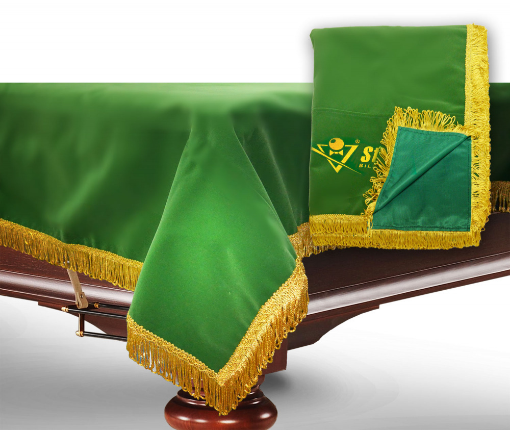 Чехол бархатный, обрамленный бахромой, надежно предохраняет бильярд от внешних воздействий. Изготовлен из бархата - мягкой ткани, с коротким ворсом и шелковистым блеском - смотрится стильно и роскошно. Края покрывала украшены ярко-желтой бахромой. Основная функция чехла — защищать бильярдный стол от повреждений, пыли и влаги, яркого солнечного света. Стол накрывают чехлом на то время, когда он не используется в игре. В любом помещении всегда есть пыль, и она будет оседать на неприкрытое сукно, постепенно впитываясь в него. Слишком частые чистки сукна щетками не желательны, так как это приводит к его преждевременному износу, а услуги по перетяжке сукна на бильярдном столе недешевы. Использование чехла является логичным решением для минимизации затрат по уходу за бильярдным столом.