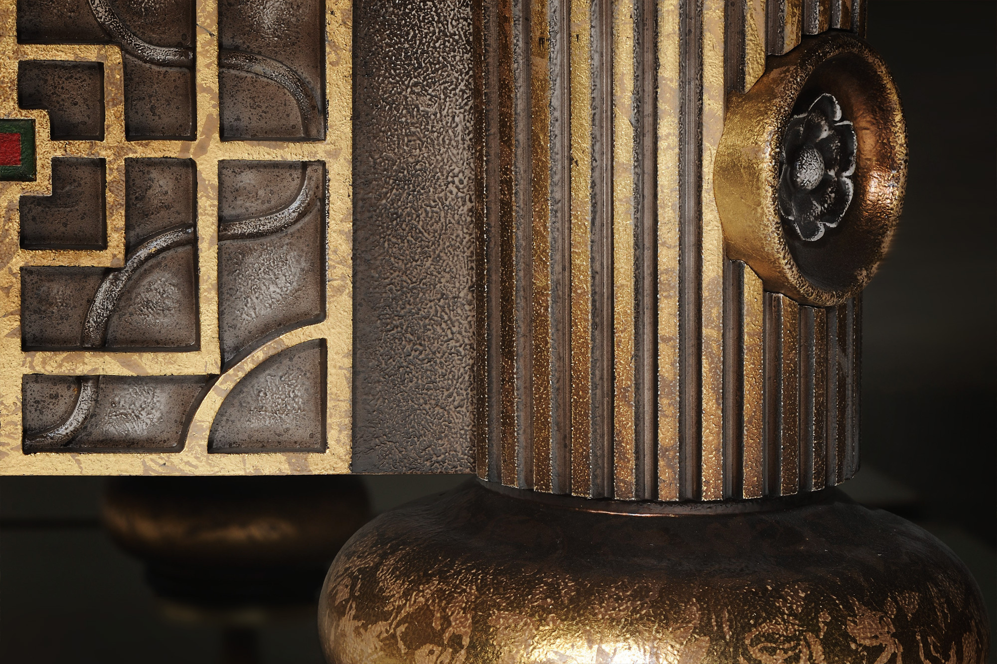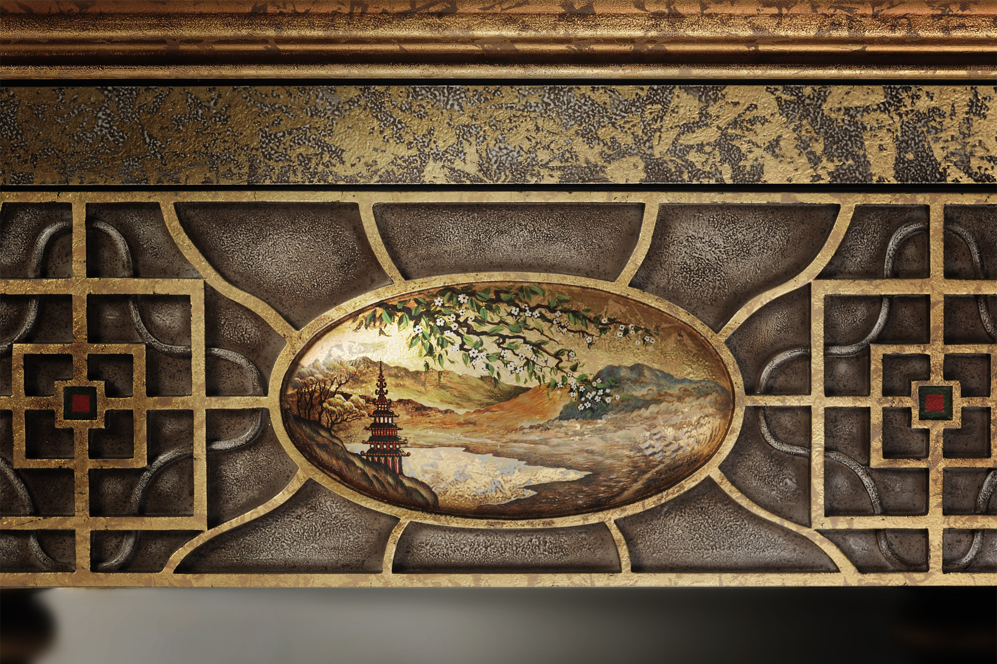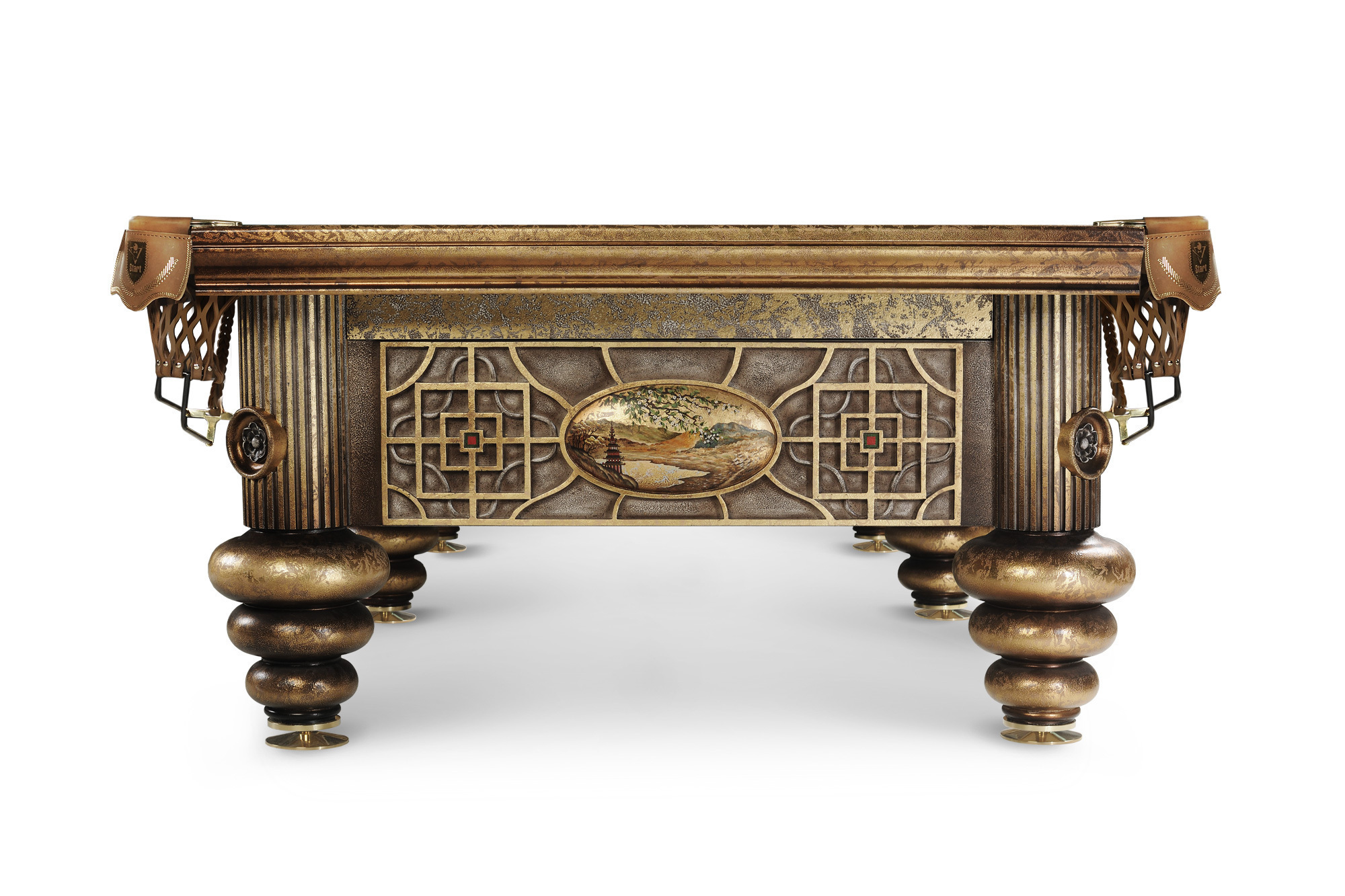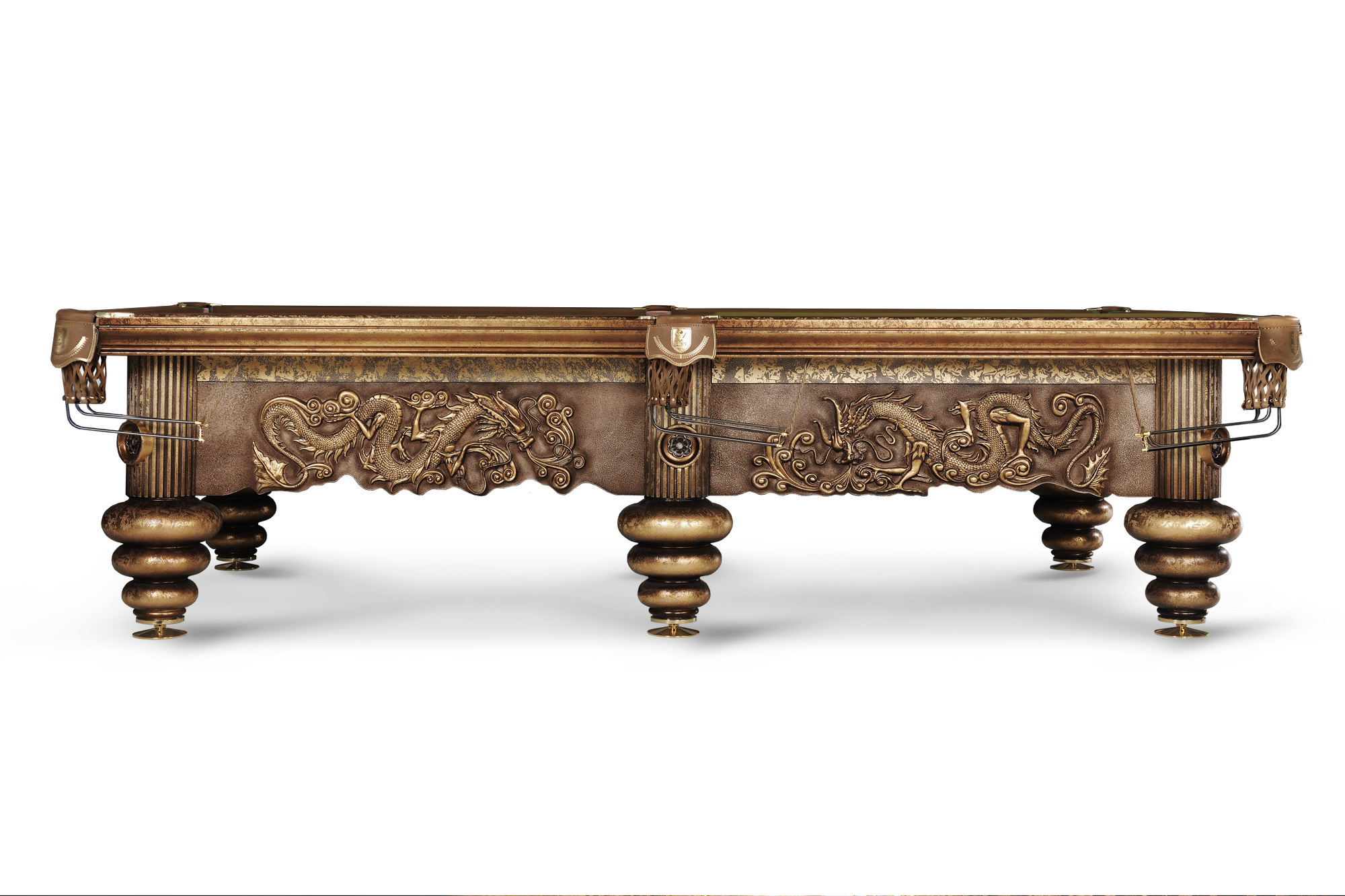 Бильярдный стол «Дракон Гранж» составляет эксклюзивную галерею столов. Основой для образа и формы послужил бильярдный стол стол Дракон, со своей яркой индивидуальностью, пронизанной философским смыслом. Характерная для «Драконов» форма ног, панно ручной работы в традиционной технике и с традиционным для китайской миниатюры сюжетом, цветы дикой сливы в резных элементах. Выкраска стола многогранна, выполняется вручную, в авторской технике с помощью нанесения золотой потали и многослойной колеровки, с сохранением тонкой стилистики. Фактура и цвет «с отголосками металла» позволяет придать поверхности уникальный вид, рельеф напоминает чеканку. Бильярдный стол «Дракон Гранж» – пример высочайшего мастерства не только в выкраске стола, но и в технологии изготовления. Роскошный бильярд выполнен из граба – такой изыск способны оценить настоящие гурманы. Металлическая рама в основании усиливает несущую конструкцию стола и обеспечивает непревзойденную устойчивость на долгие годы.