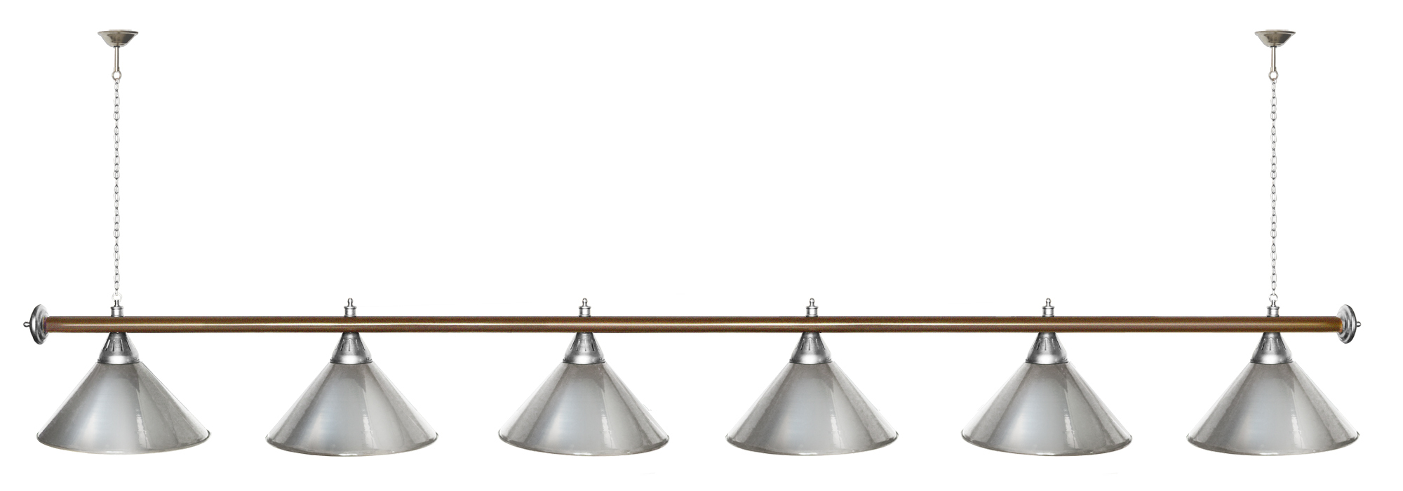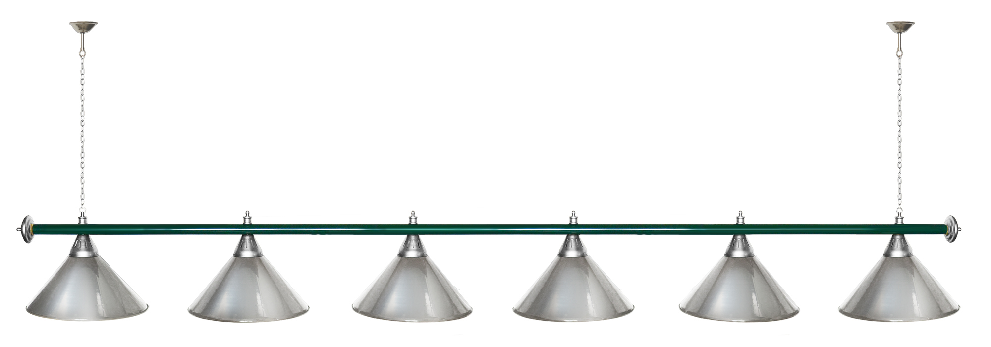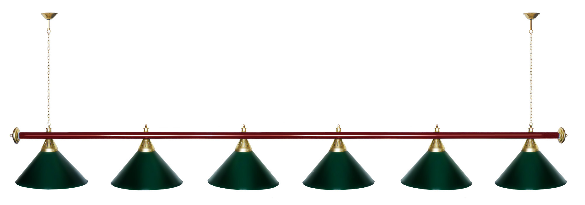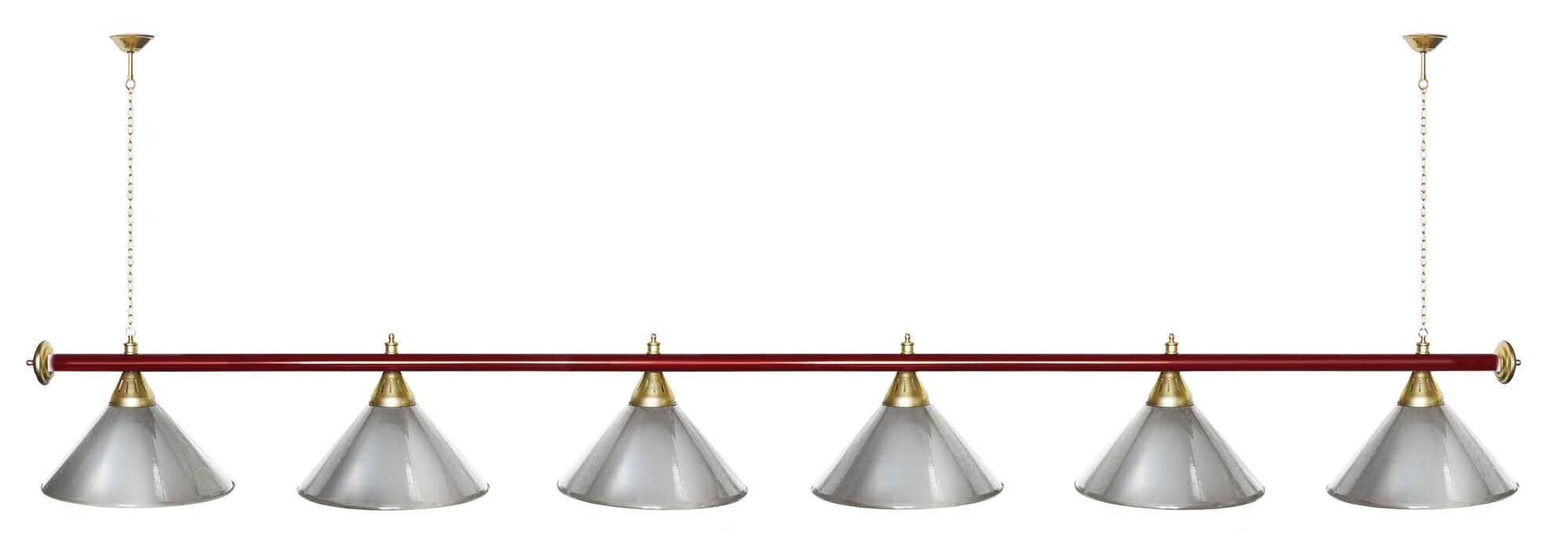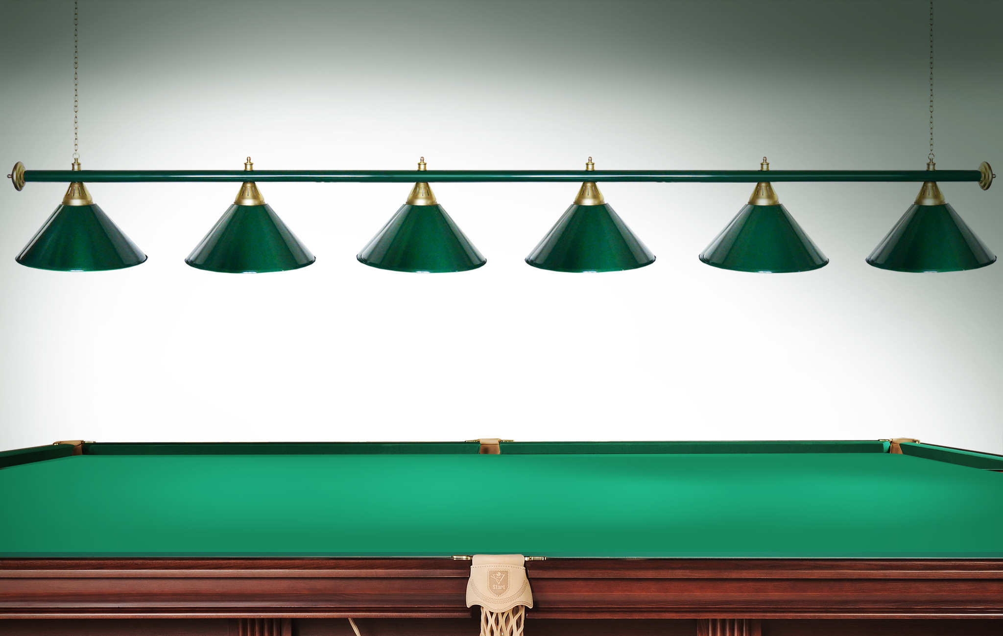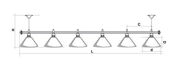 Светильники Startbilliards производства ФС «Горизонт» с 6-ю плафонами комплектуются к столам 12 футов. Укомплектованы цельной металлической штангой с полимерным покрытием. Штанга изготовлена из цельной трубы, что исключает искривление конструкции. Применение керамических патронов #40;Е27#41; увеличивает срок эксплуатации светильника. Металлические плафоны крепятся с помощью зажимных пластин. Длина подвесной цепи 100 см — оптимальное расстояние для расположения источника света над игровым полем стола. В комплект включены две потолочные чашки. Условные схематические обозначения: Н — общая высота светильника / 1420 мм L — общая длина светильника / 2920 мм D — высота плафона / 300 мм d — диаметр плафона / 370 мм C — расстояние между осями / 500 мм Штанга и плафоны поставляются в отдельных упаковках.