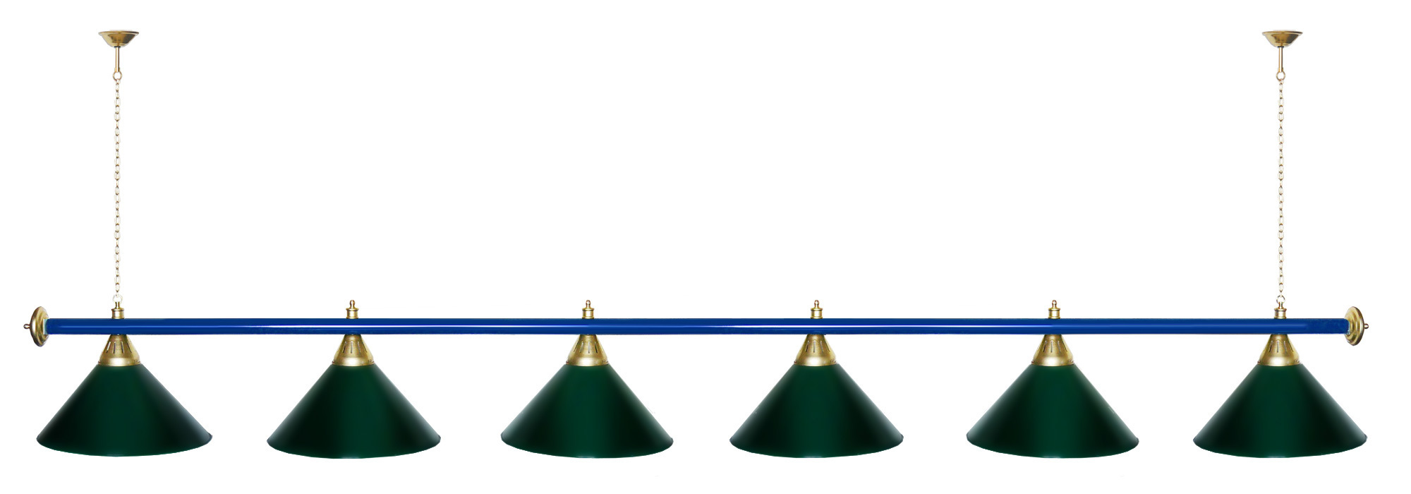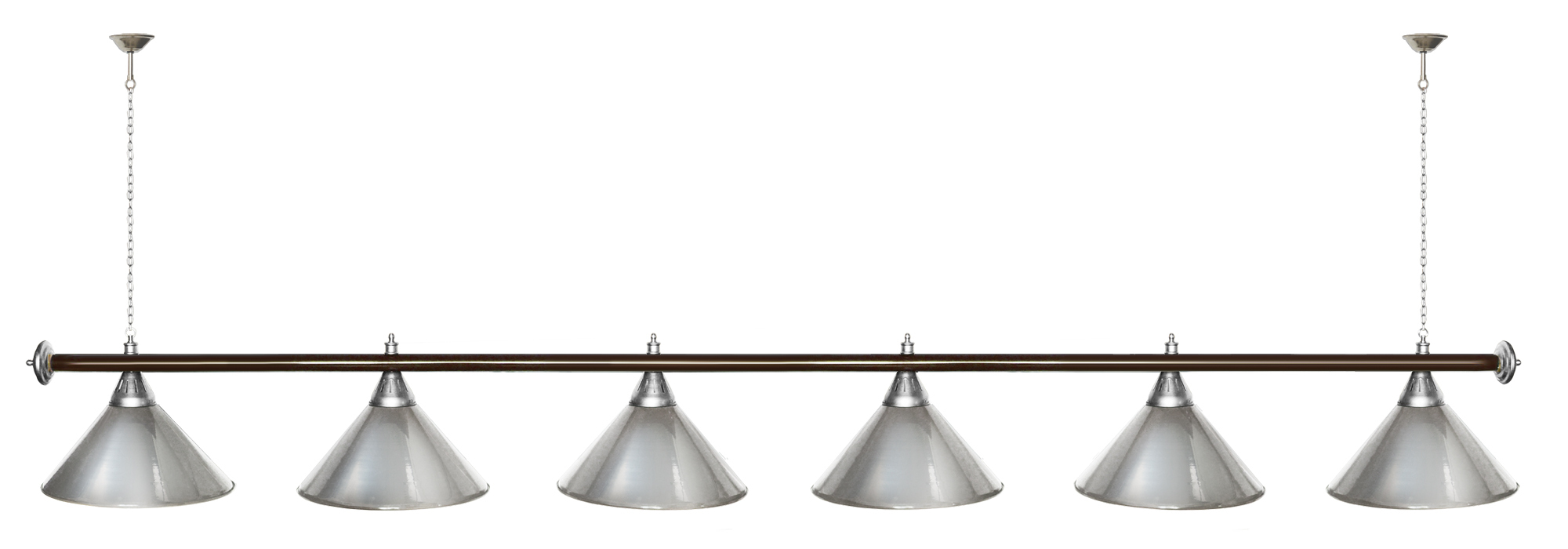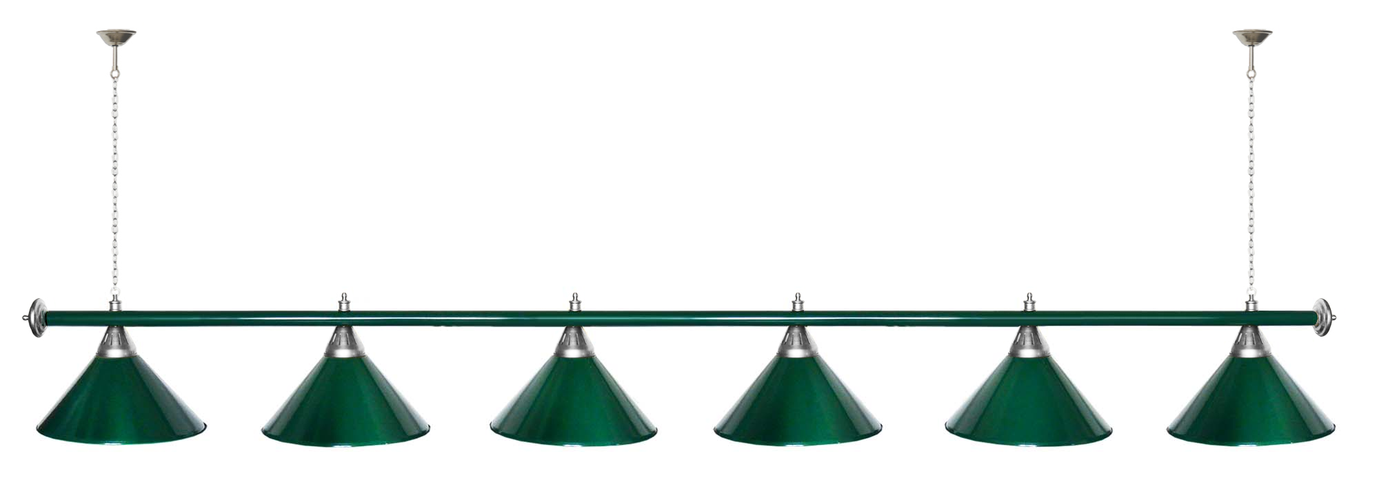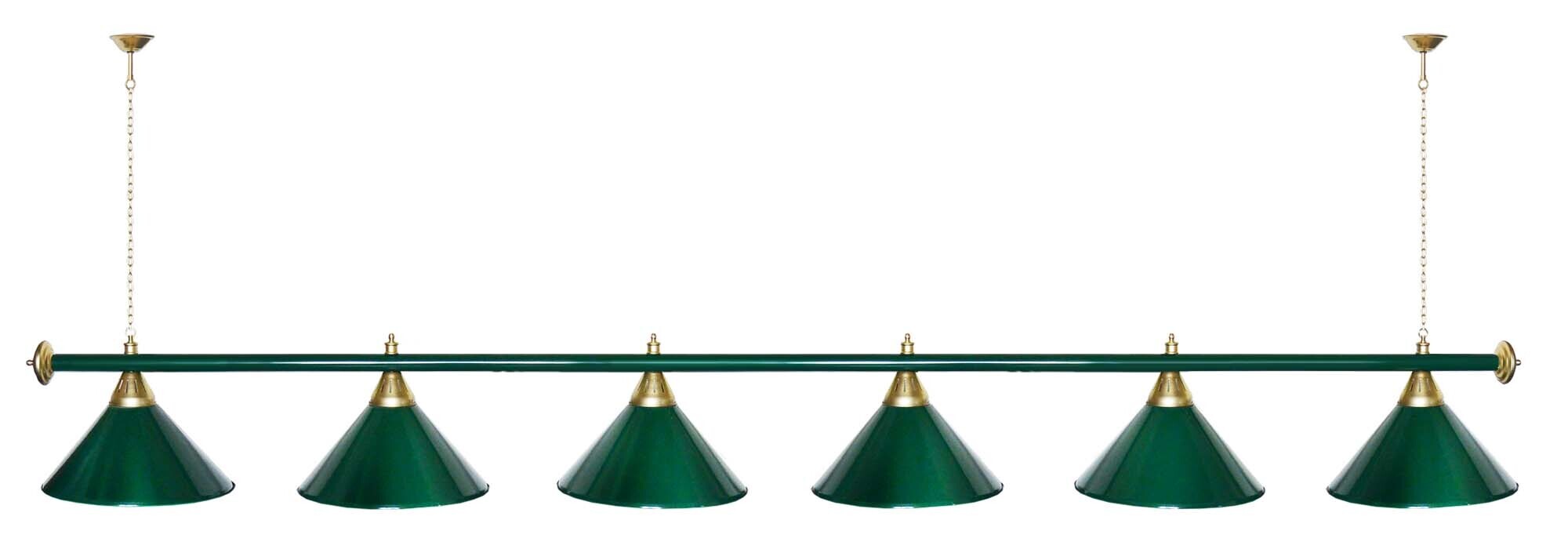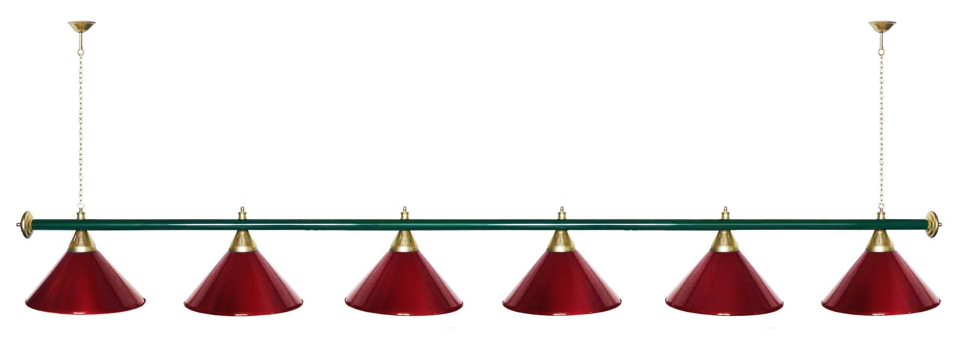 Светильники Startbilliards производства ФС «Горизонт» с 6-ю плафонами комплектуются к столам 12 футов. Укомплектованы цельной металлической штангой с полимерным покрытием. Штанга изготовлена из цельной трубы, что исключает искривление конструкции. Применение керамических патронов #40;Е27#41; увеличивает срок эксплуатации светильника. Металлические плафоны крепятся с помощью зажимных пластин. Длина подвесной цепи 100 см — оптимальное расстояние для расположения источника света над игровым полем стола. В комплект включены две потолочные чашки. Условные схематические обозначения: Н — общая высота светильника / 1420 мм L — общая длина светильника / 2920 мм D — высота плафона / 300 мм d — диаметр плафона / 370 мм C — расстояние между осями / 500 мм Штанга и плафоны поставляются в отдельных упаковках.
