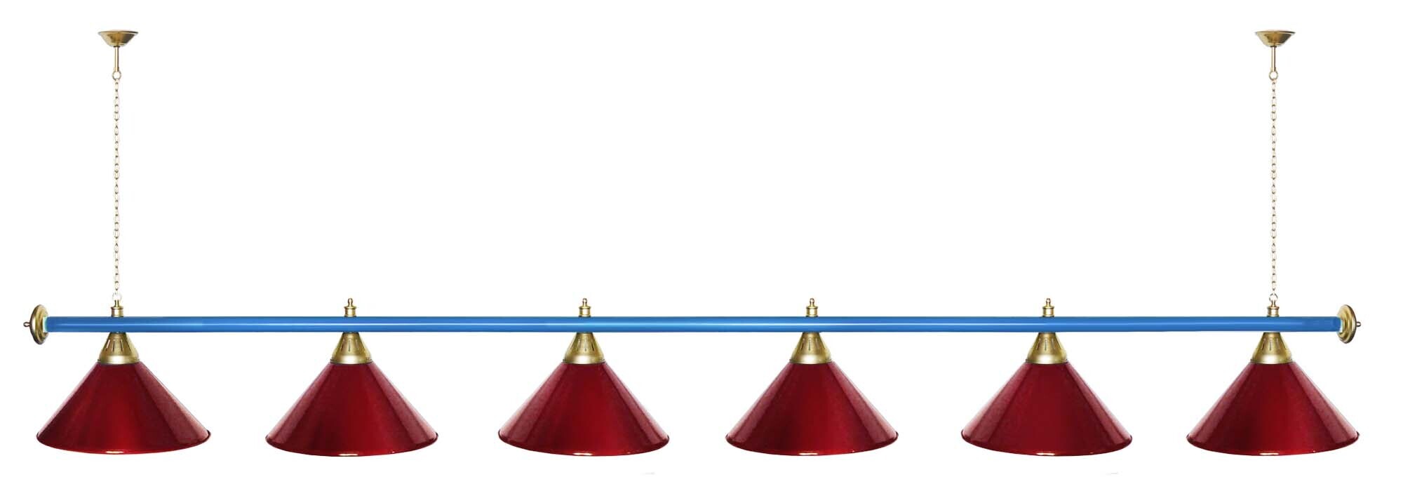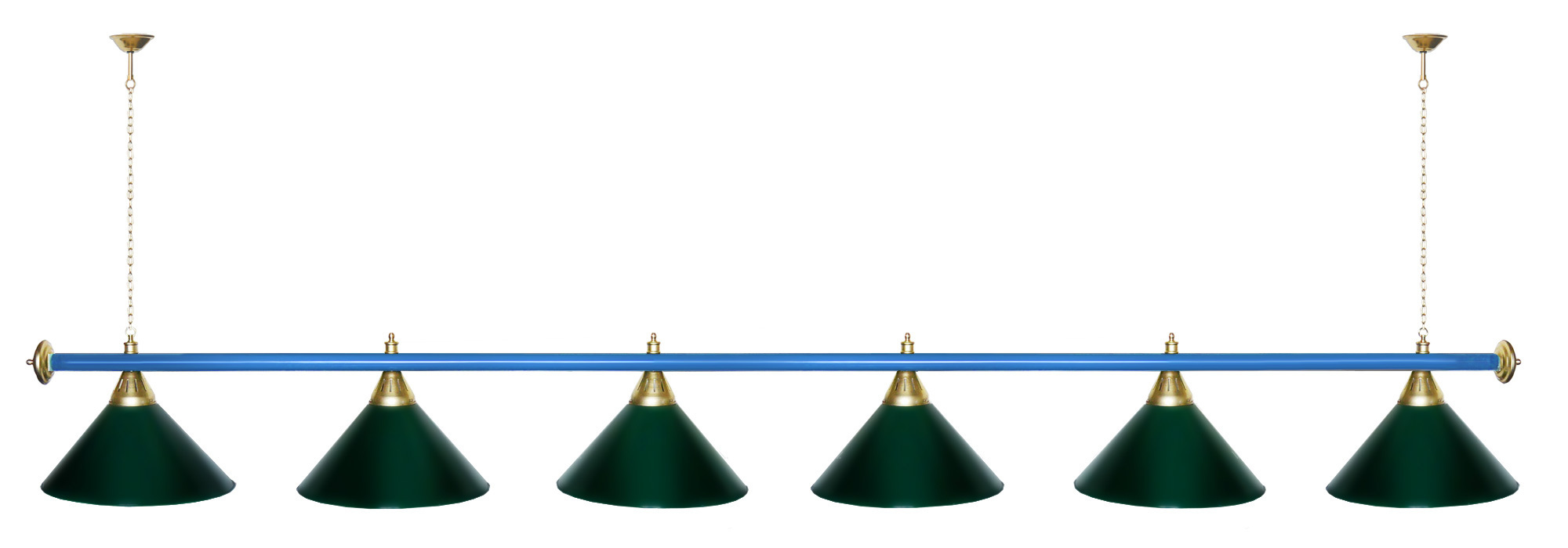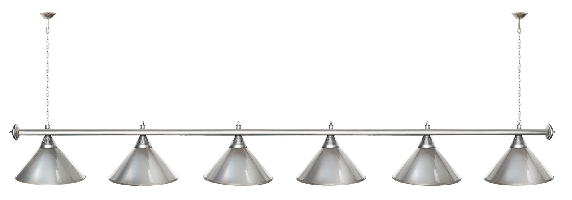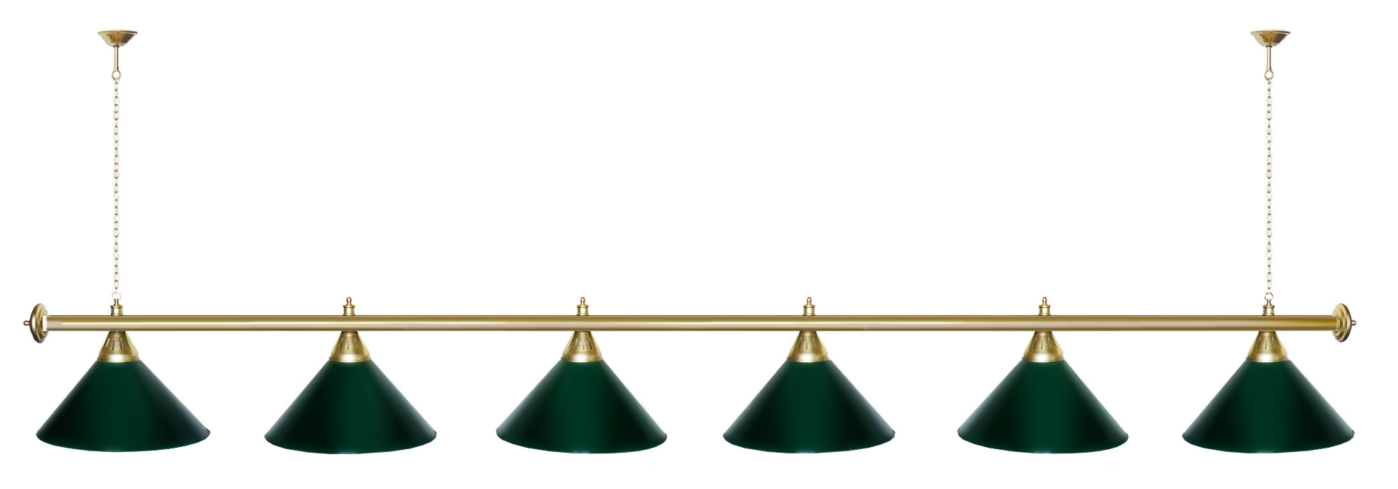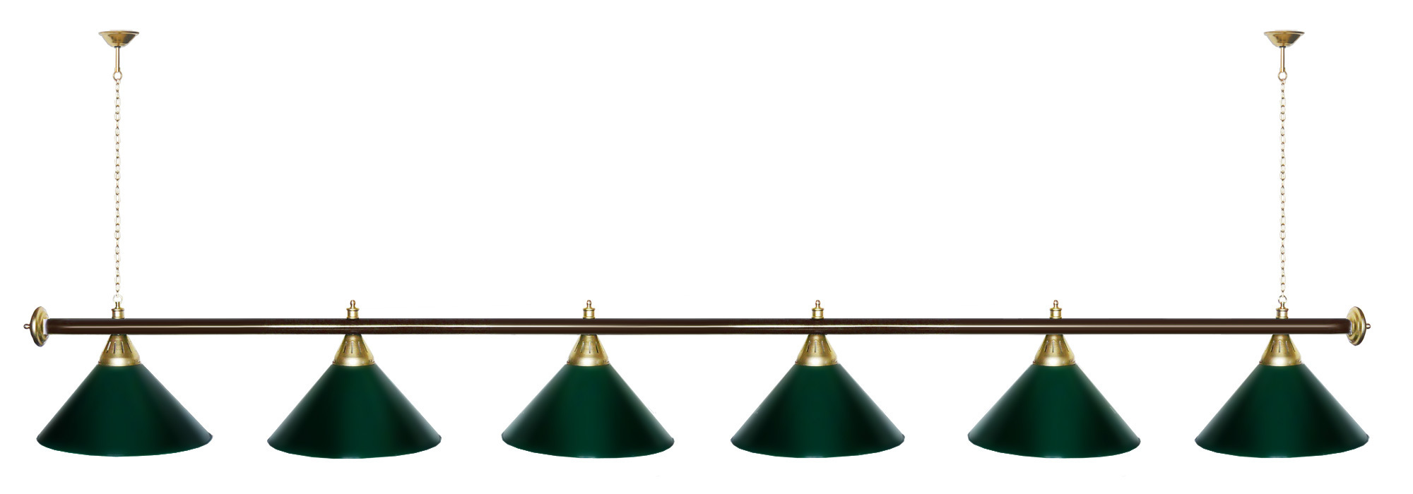 Светильники Startbilliards производства ФС «Горизонт» с 6-ю плафонами комплектуются к столам 12 футов. Укомплектованы цельной металлической штангой с полимерным покрытием. Штанга изготовлена из цельной трубы, что исключает искривление конструкции. Применение керамических патронов #40;Е27#41; увеличивает срок эксплуатации светильника. Металлические плафоны крепятся с помощью зажимных пластин. Длина подвесной цепи 100 см — оптимальное расстояние для расположения источника света над игровым полем стола. В комплект включены две потолочные чашки. Условные схематические обозначения: Н — общая высота светильника / 1420 мм L — общая длина светильника / 2920 мм D — высота плафона / 300 мм d — диаметр плафона / 370 мм C — расстояние между осями / 500 мм Штанга и плафоны поставляются в отдельных упаковках.