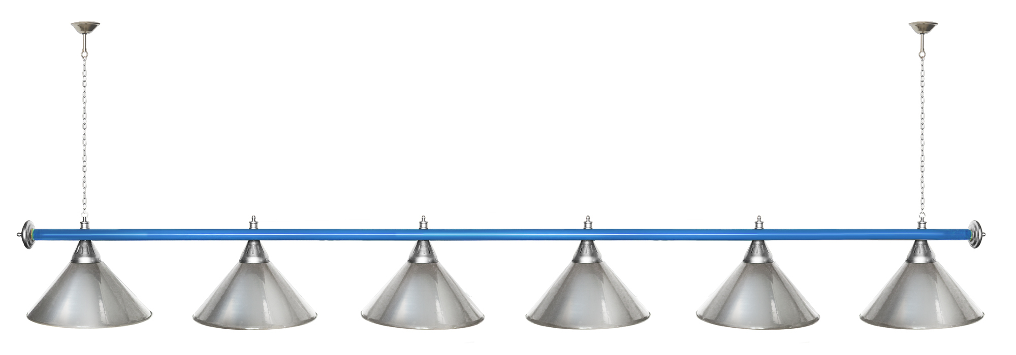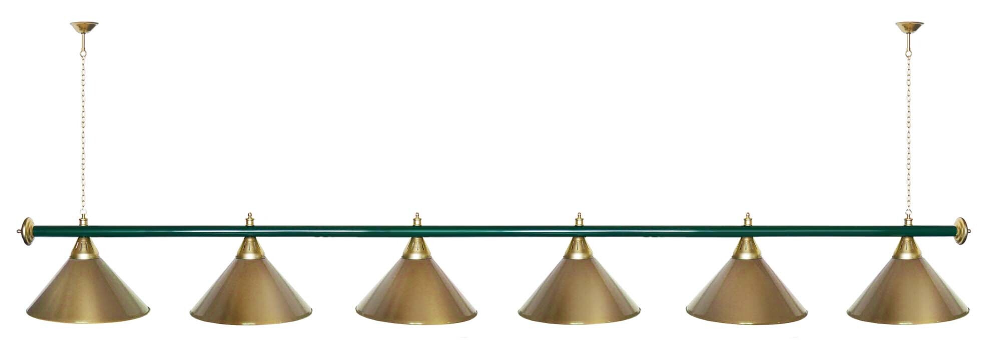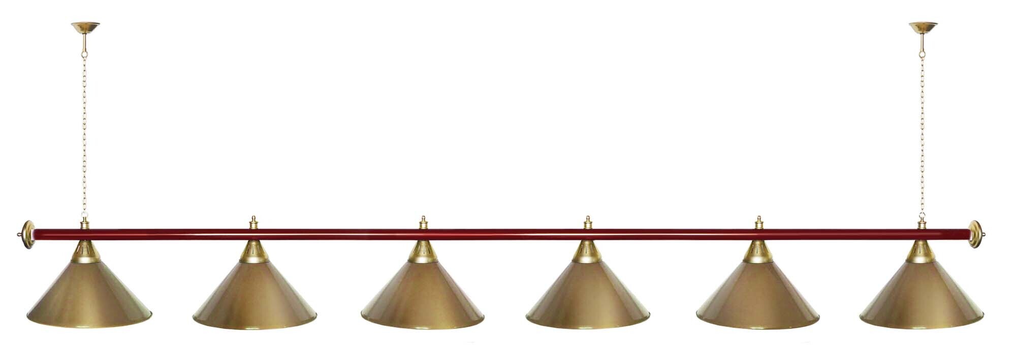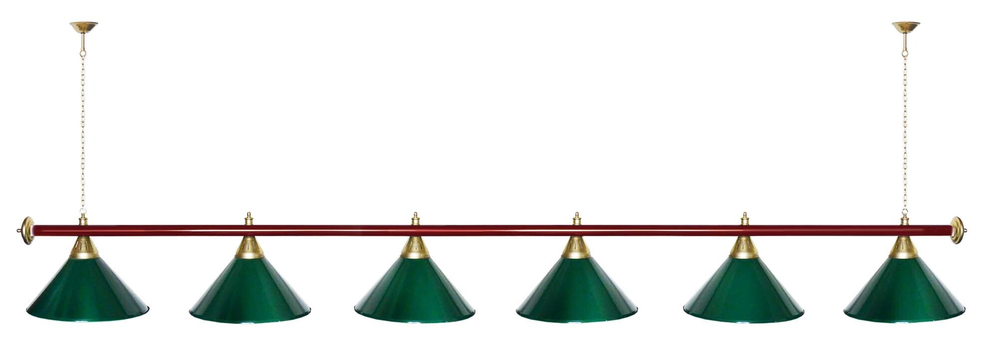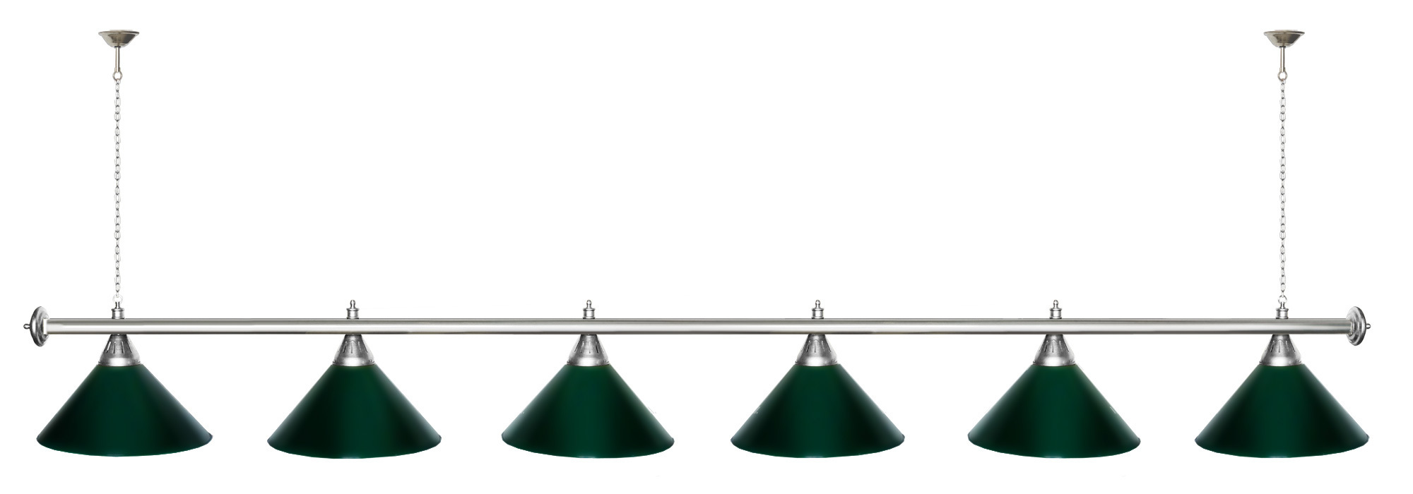 Светильники Startbilliards производства ФС «Горизонт» с 6-ю плафонами комплектуются к столам 12 футов. Укомплектованы цельной металлической штангой с полимерным покрытием. Штанга изготовлена из цельной трубы, что исключает искривление конструкции. Применение керамических патронов #40;Е27#41; увеличивает срок эксплуатации светильника. Металлические плафоны крепятся с помощью зажимных пластин. Длина подвесной цепи 100 см — оптимальное расстояние для расположения источника света над игровым полем стола. В комплект включены две потолочные чашки. Условные схематические обозначения: Н — общая высота светильника / 1420 мм L — общая длина светильника / 2920 мм D — высота плафона / 300 мм d — диаметр плафона / 370 мм C — расстояние между осями / 500 мм Штанга и плафоны поставляются в отдельных упаковках.