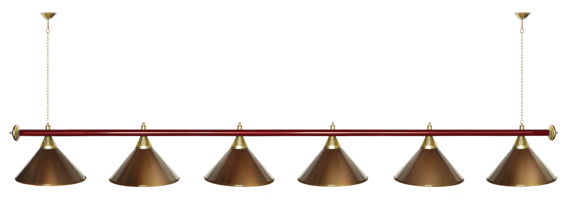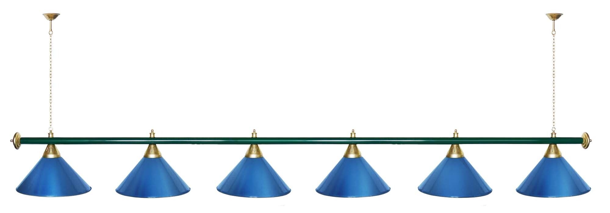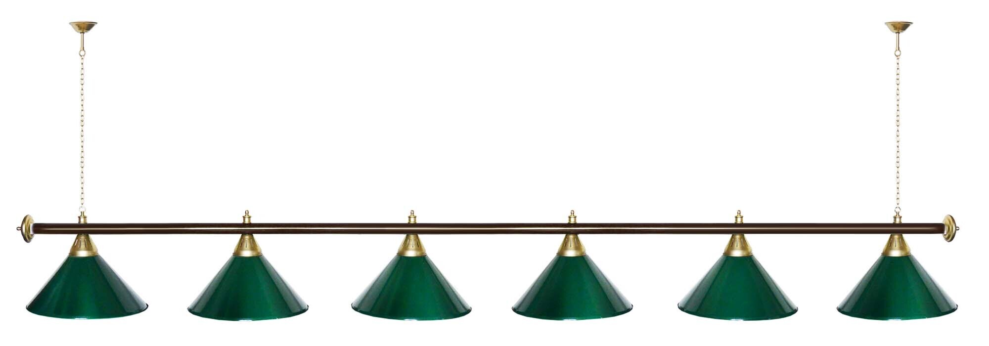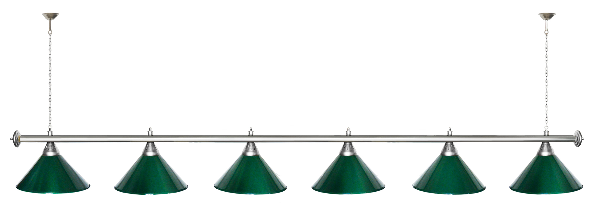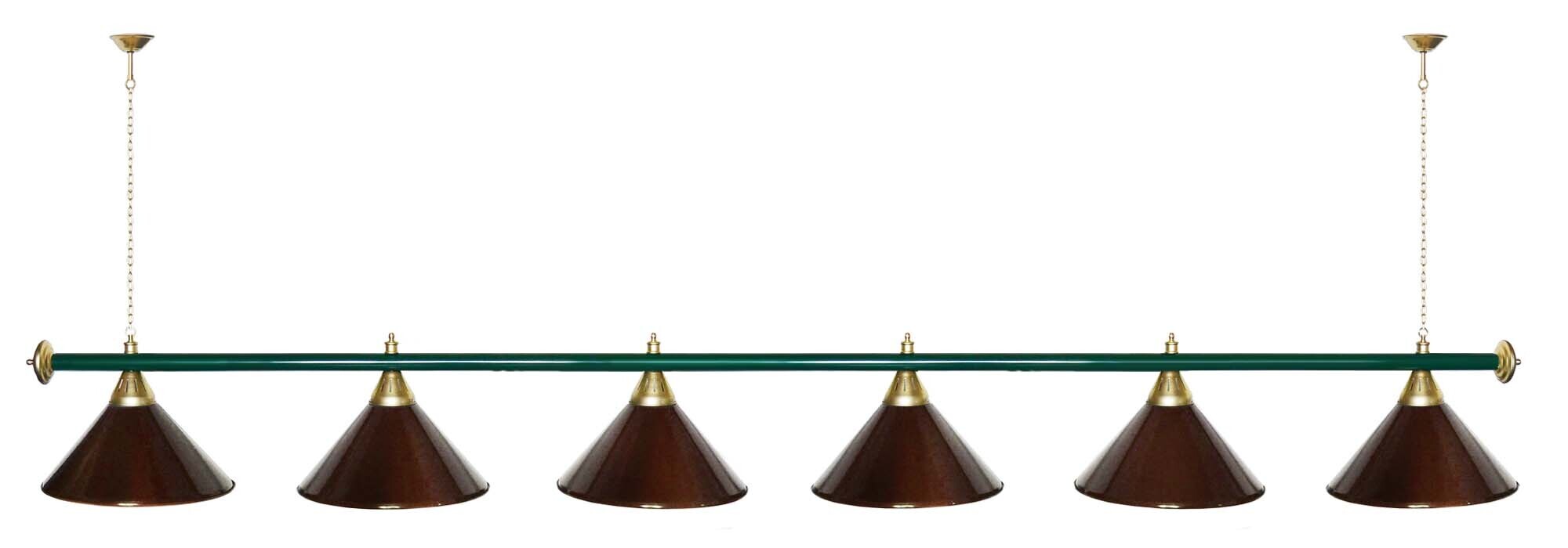 Светильники Startbilliards производства ФС «Горизонт» с 6-ю плафонами комплектуются к столам 12 футов. Укомплектованы цельной металлической штангой с полимерным покрытием. Штанга изготовлена из цельной трубы, что исключает искривление конструкции. Применение керамических патронов #40;Е27#41; увеличивает срок эксплуатации светильника. Металлические плафоны крепятся с помощью зажимных пластин. Длина подвесной цепи 100 см — оптимальное расстояние для расположения источника света над игровым полем стола. В комплект включены две потолочные чашки. Условные схематические обозначения: Н — общая высота светильника / 1420 мм L — общая длина светильника / 2920 мм D — высота плафона / 300 мм d — диаметр плафона / 370 мм C — расстояние между осями / 500 мм Штанга и плафоны поставляются в отдельных упаковках.