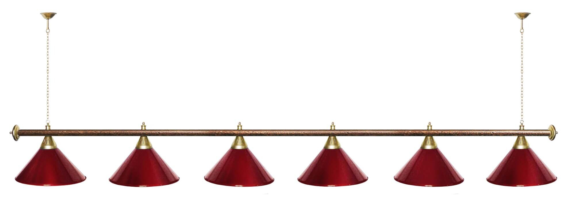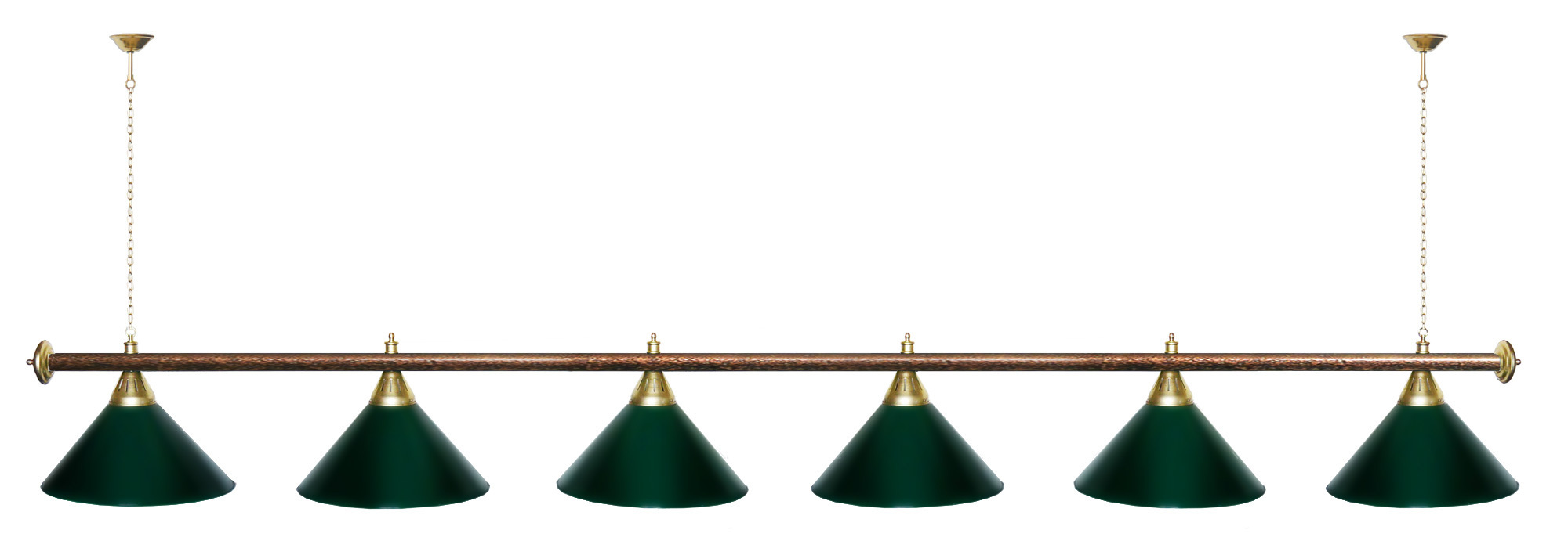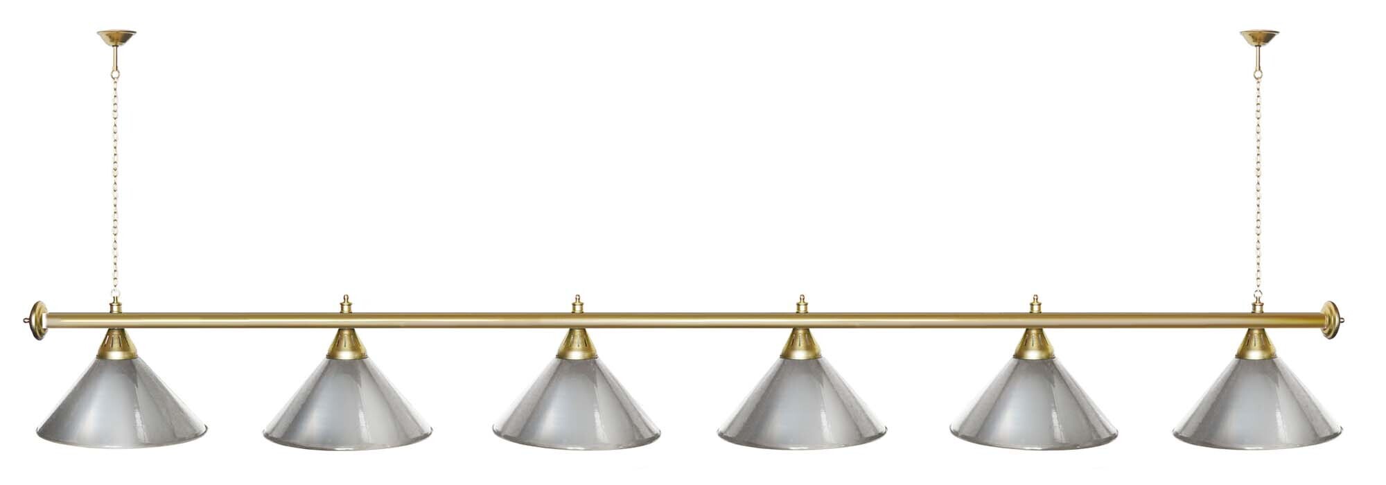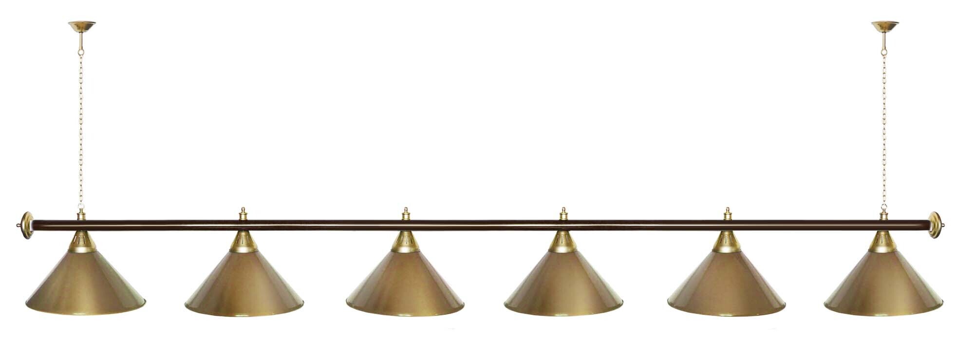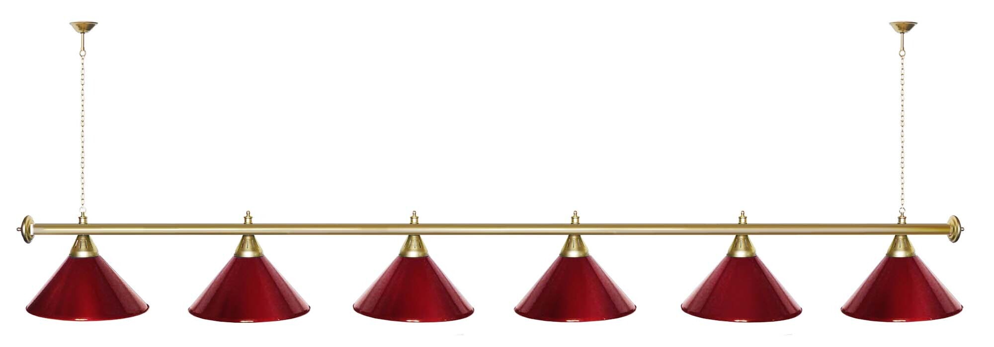 Светильники Startbilliards производства ФС «Горизонт» с 6-ю плафонами комплектуются к столам 12 футов. Укомплектованы цельной металлической штангой с полимерным покрытием. Штанга изготовлена из цельной трубы, что исключает искривление конструкции. Применение керамических патронов #40;Е27#41; увеличивает срок эксплуатации светильника. Металлические плафоны крепятся с помощью зажимных пластин. Длина подвесной цепи 100 см — оптимальное расстояние для расположения источника света над игровым полем стола. В комплект включены две потолочные чашки. Условные схематические обозначения: Н — общая высота светильника / 1420 мм L — общая длина светильника / 2920 мм D — высота плафона / 300 мм d — диаметр плафона / 370 мм C — расстояние между осями / 500 мм Штанга и плафоны поставляются в отдельных упаковках.