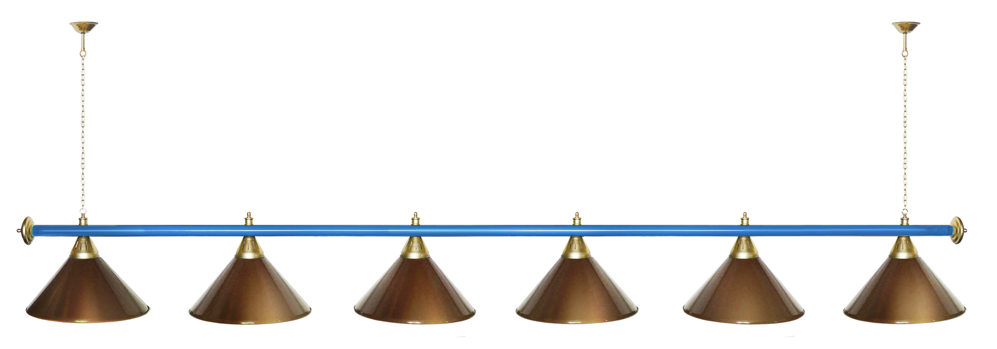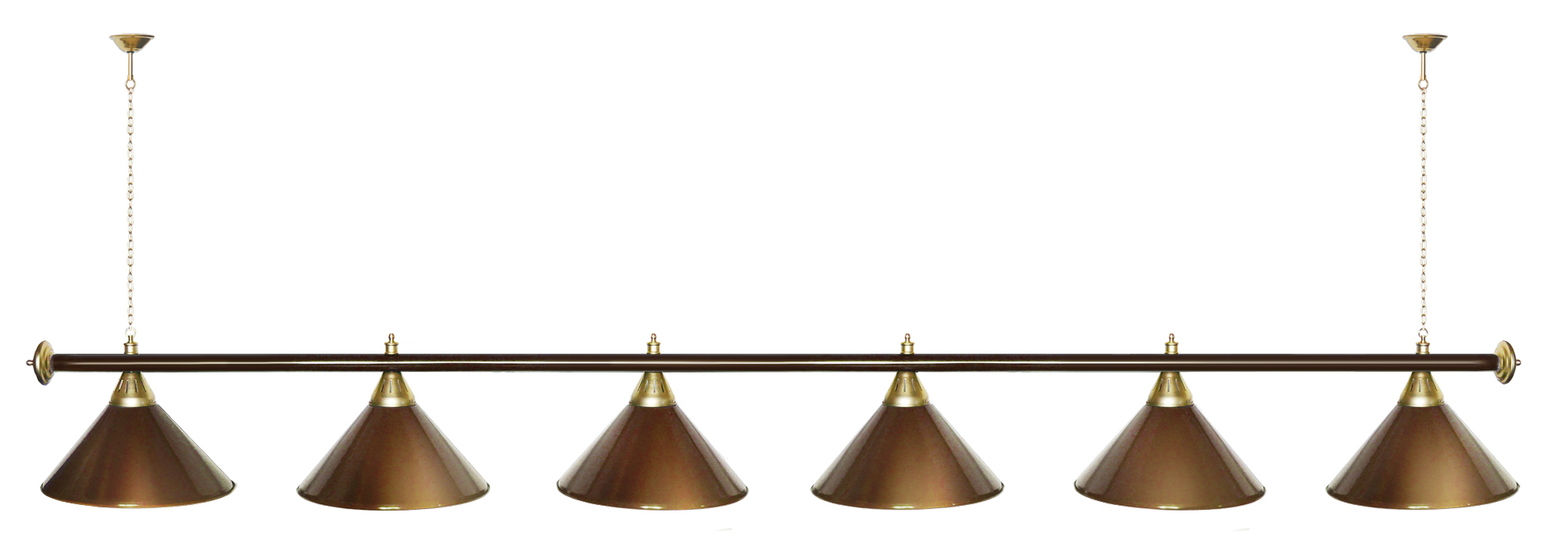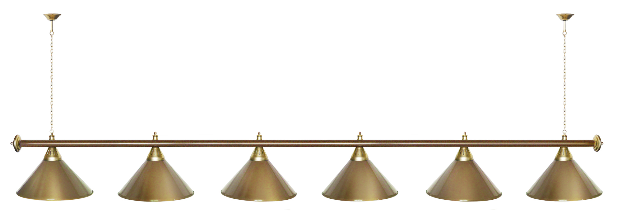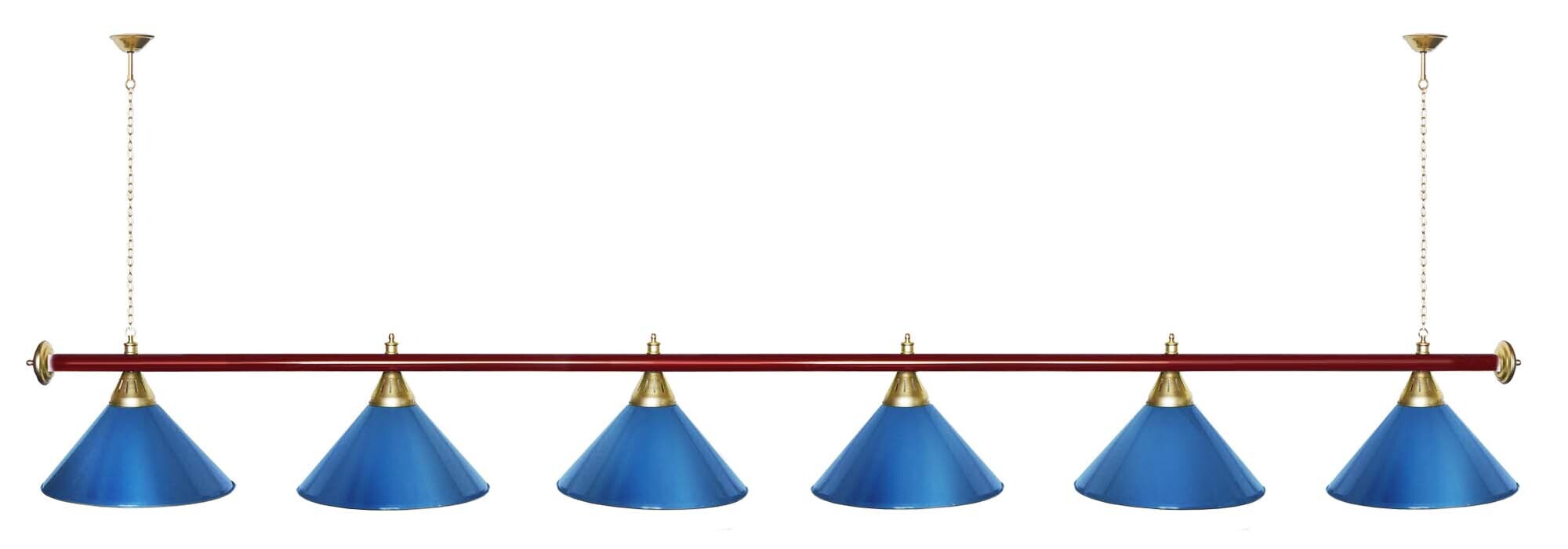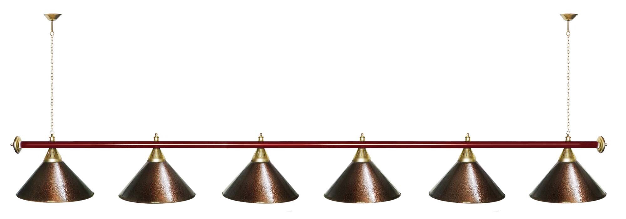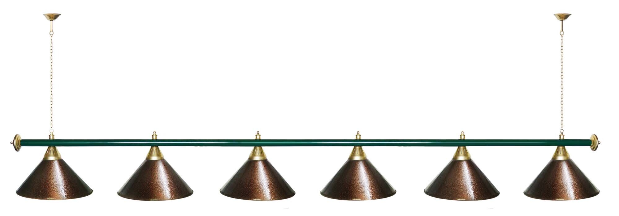 Светильники Startbilliards производства ФС «Горизонт» с 6-ю плафонами комплектуются к столам 12 футов. Укомплектованы цельной металлической штангой с полимерным покрытием. Штанга изготовлена из цельной трубы, что исключает искривление конструкции. Применение керамических патронов #40;Е27#41; увеличивает срок эксплуатации светильника. Металлические плафоны крепятся с помощью зажимных пластин. Длина подвесной цепи 100 см — оптимальное расстояние для расположения источника света над игровым полем стола. В комплект включены две потолочные чашки. Условные схематические обозначения: Н — общая высота светильника / 1420 мм L — общая длина светильника / 2920 мм D — высота плафона / 300 мм d — диаметр плафона / 370 мм C — расстояние между осями / 500 мм Штанга и плафоны поставляются в отдельных упаковках.
