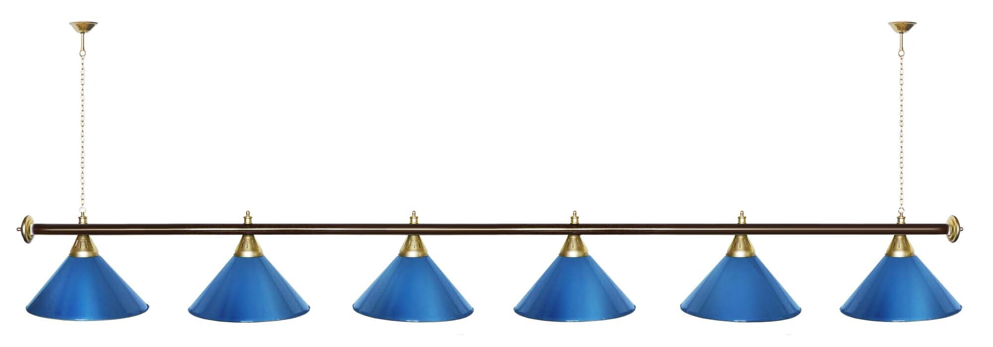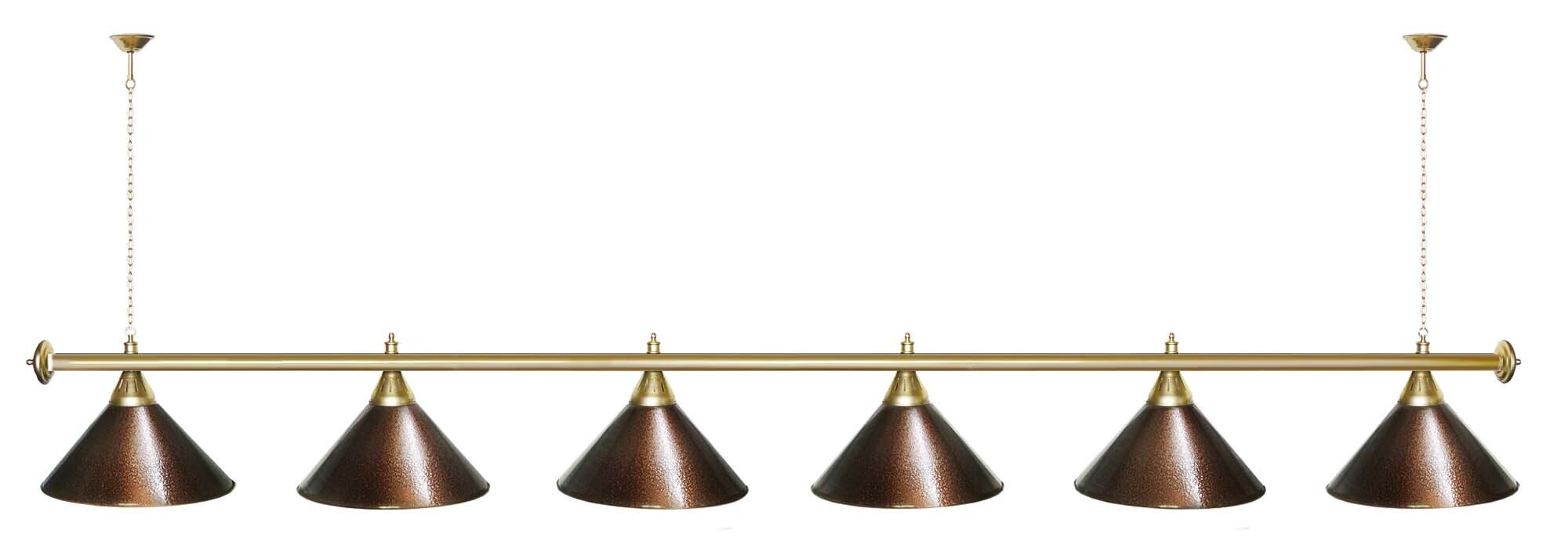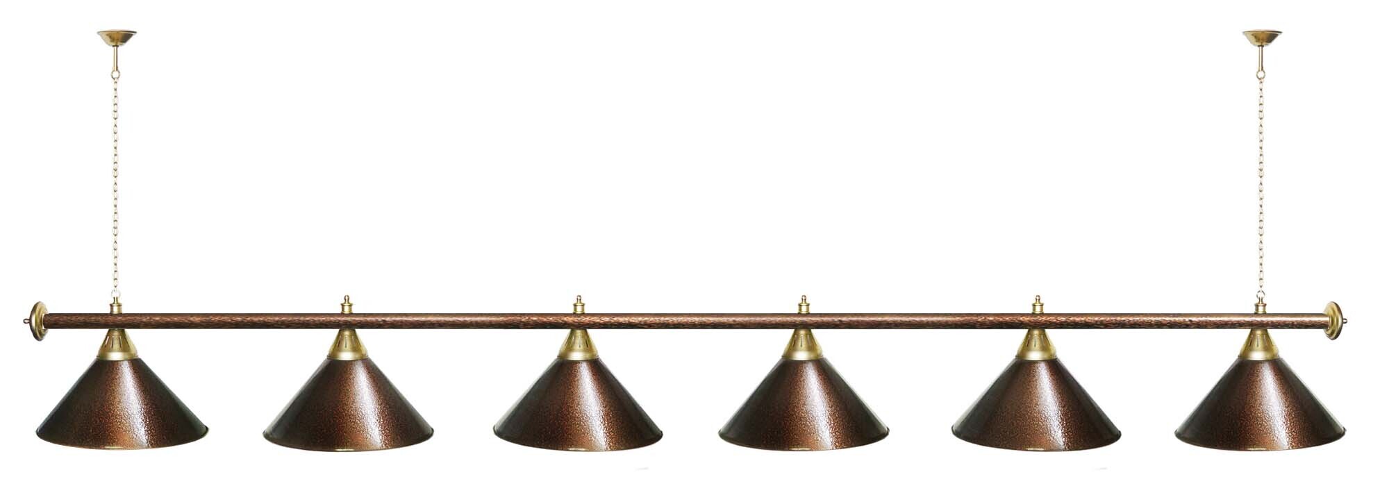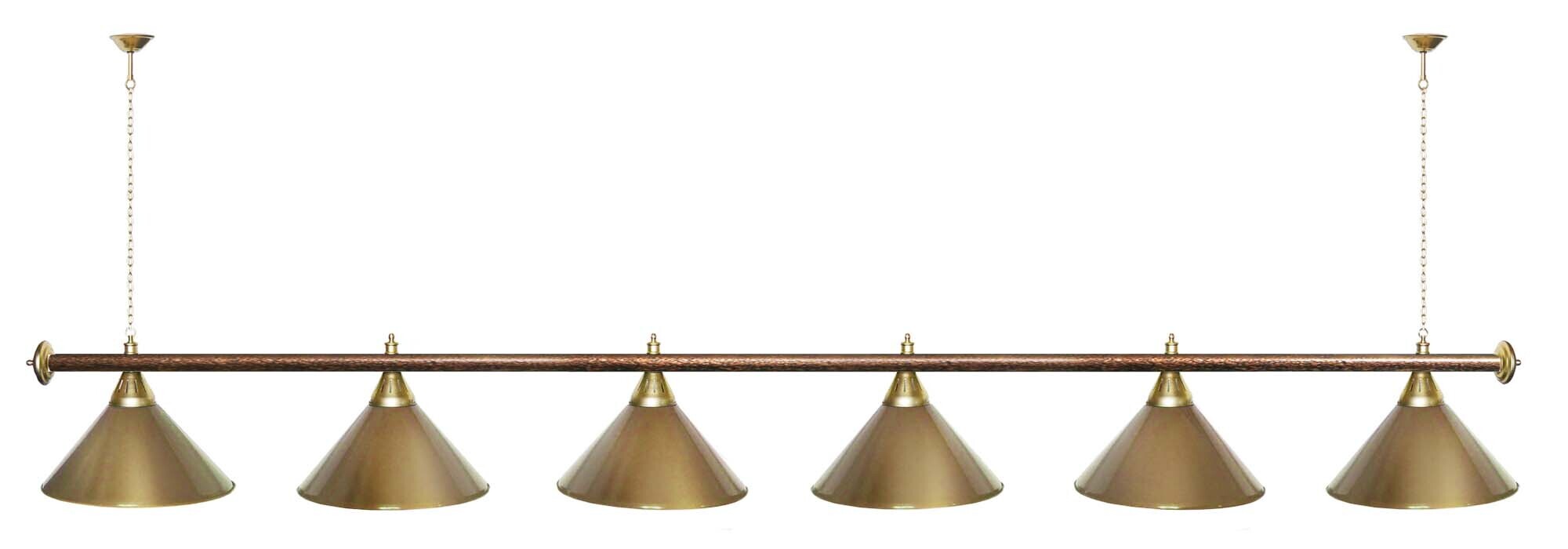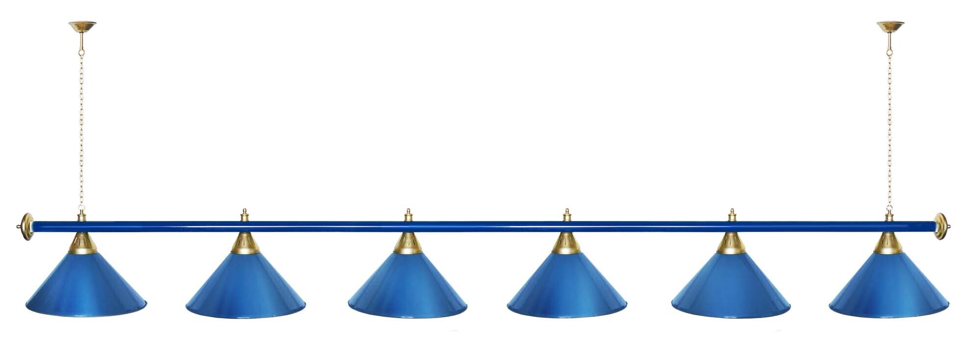 Светильники Startbilliards производства ФС «Горизонт» с 6-ю плафонами комплектуются к столам 12 футов. Укомплектованы цельной металлической штангой с полимерным покрытием. Штанга изготовлена из цельной трубы, что исключает искривление конструкции. Применение керамических патронов #40;Е27#41; увеличивает срок эксплуатации светильника. Металлические плафоны крепятся с помощью зажимных пластин. Длина подвесной цепи 100 см — оптимальное расстояние для расположения источника света над игровым полем стола. В комплект включены две потолочные чашки. Условные схематические обозначения: Н — общая высота светильника / 1420 мм L — общая длина светильника / 2920 мм D — высота плафона / 300 мм d — диаметр плафона / 370 мм C — расстояние между осями / 500 мм Штанга и плафоны поставляются в отдельных упаковках.