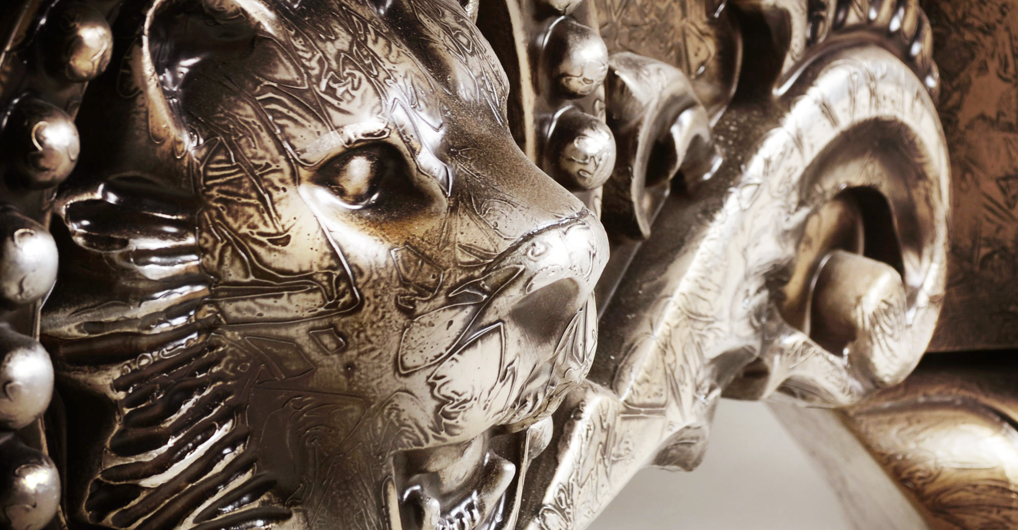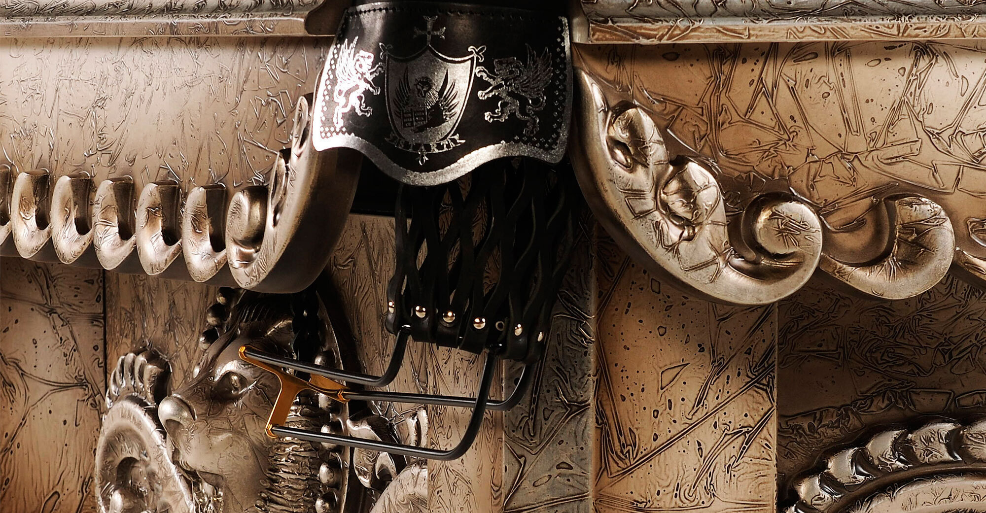 От предшественника «Лео II» отличает отделка. Это более фактурный стол, с ярко выраженным рыцарским характером. Причудливая сетка «шрамов» сплетается в единый благородный декор, наполняя сам стол духом средневекового историзма, придавая поверхности эффект металла. Выкраска стола выполняется вручную. Червленое серебро потали, авторское патинирование, россыпь рельефа и резных элементов представляют восхитительное сочетание. Лафет украшают львиные головы, ноги стола - это львиные лапы, которые изысканны и основательны одновременно.