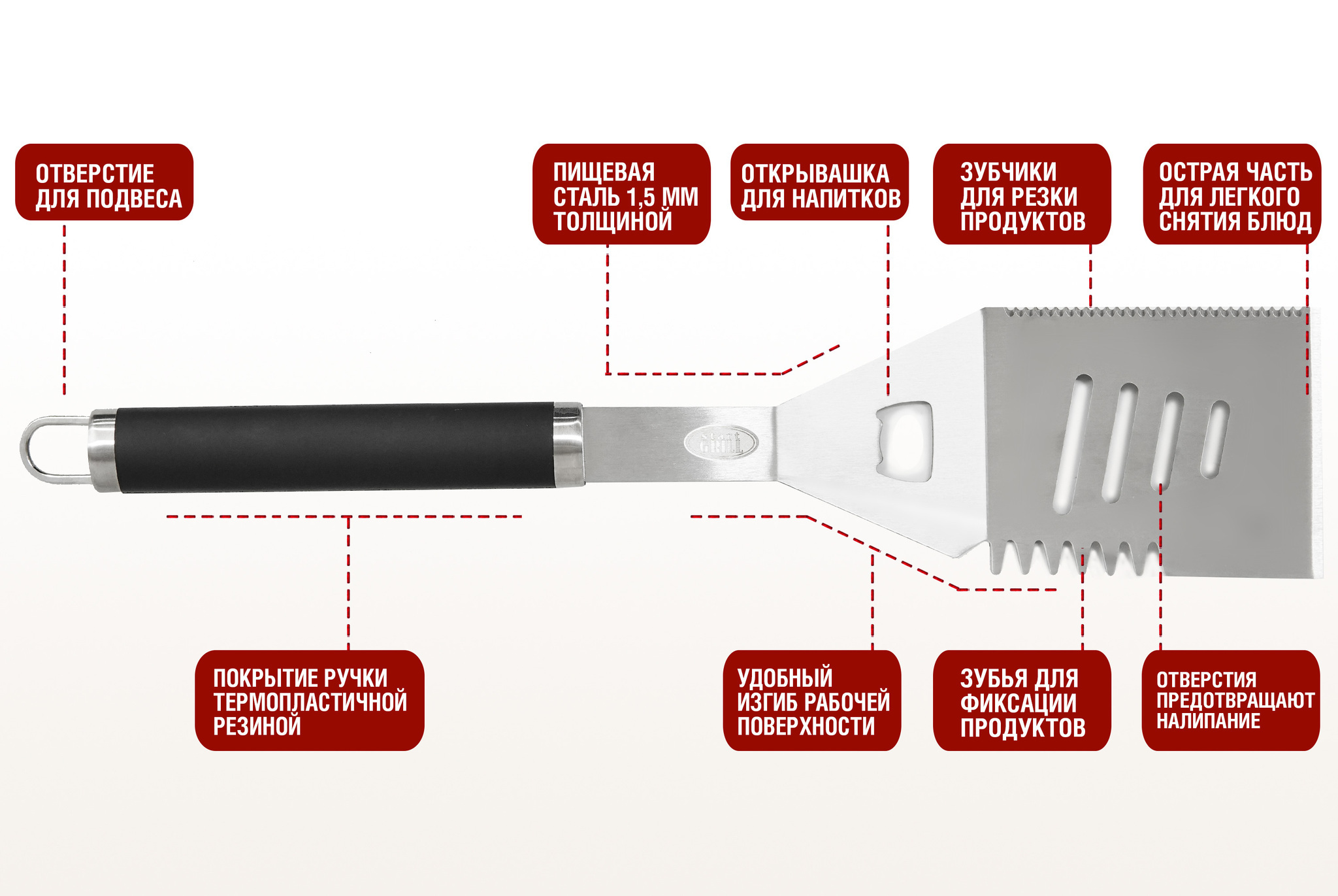 Для любителей устраивать пикники на природе и готовить отличные блюда на гриле. Лопатка для гриля от Start Grillnbsp;nbsp;применяется для приготовления пищи на открытом воздухе. Изготовлена из нержавеющей стали, удобная ручкаnbsp;nbsp;покрыта термопластичной резиной. Удобна в использовании и безопасна для здоровья.