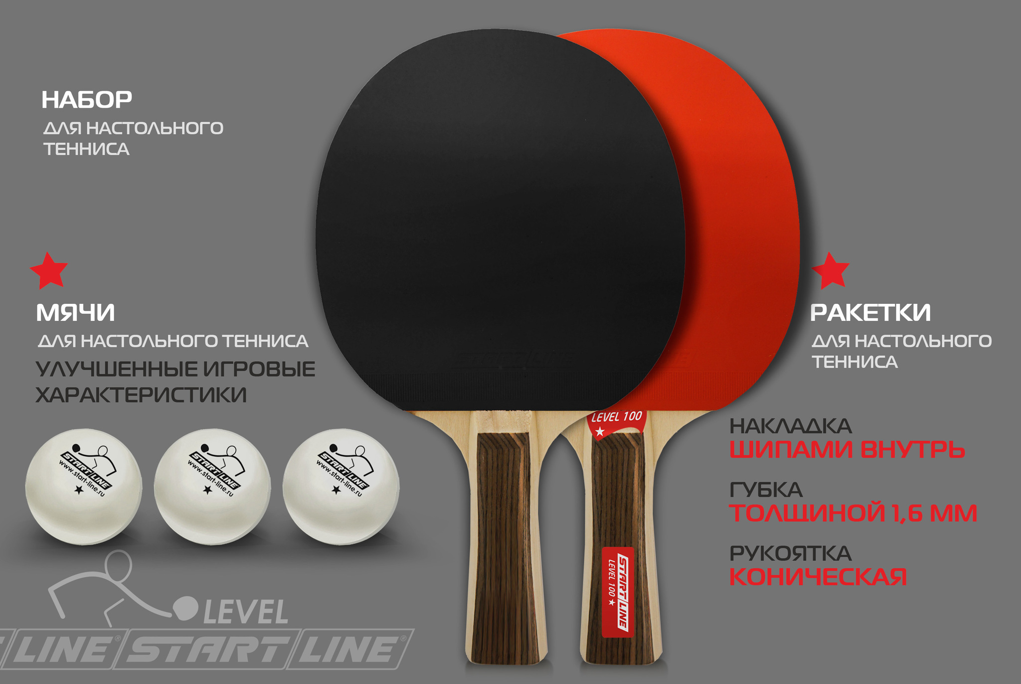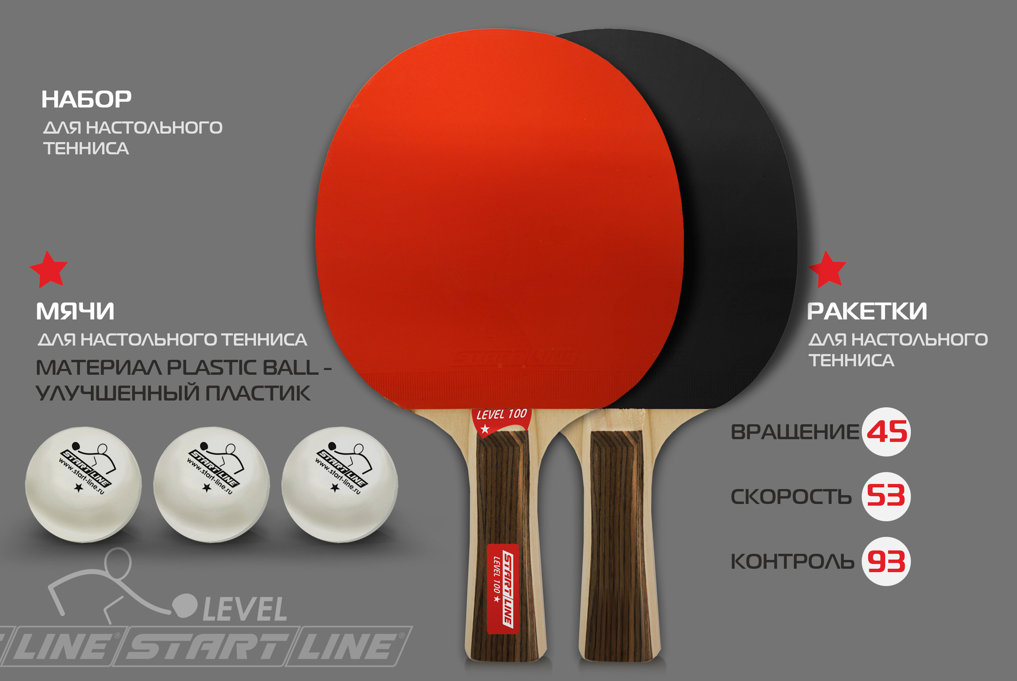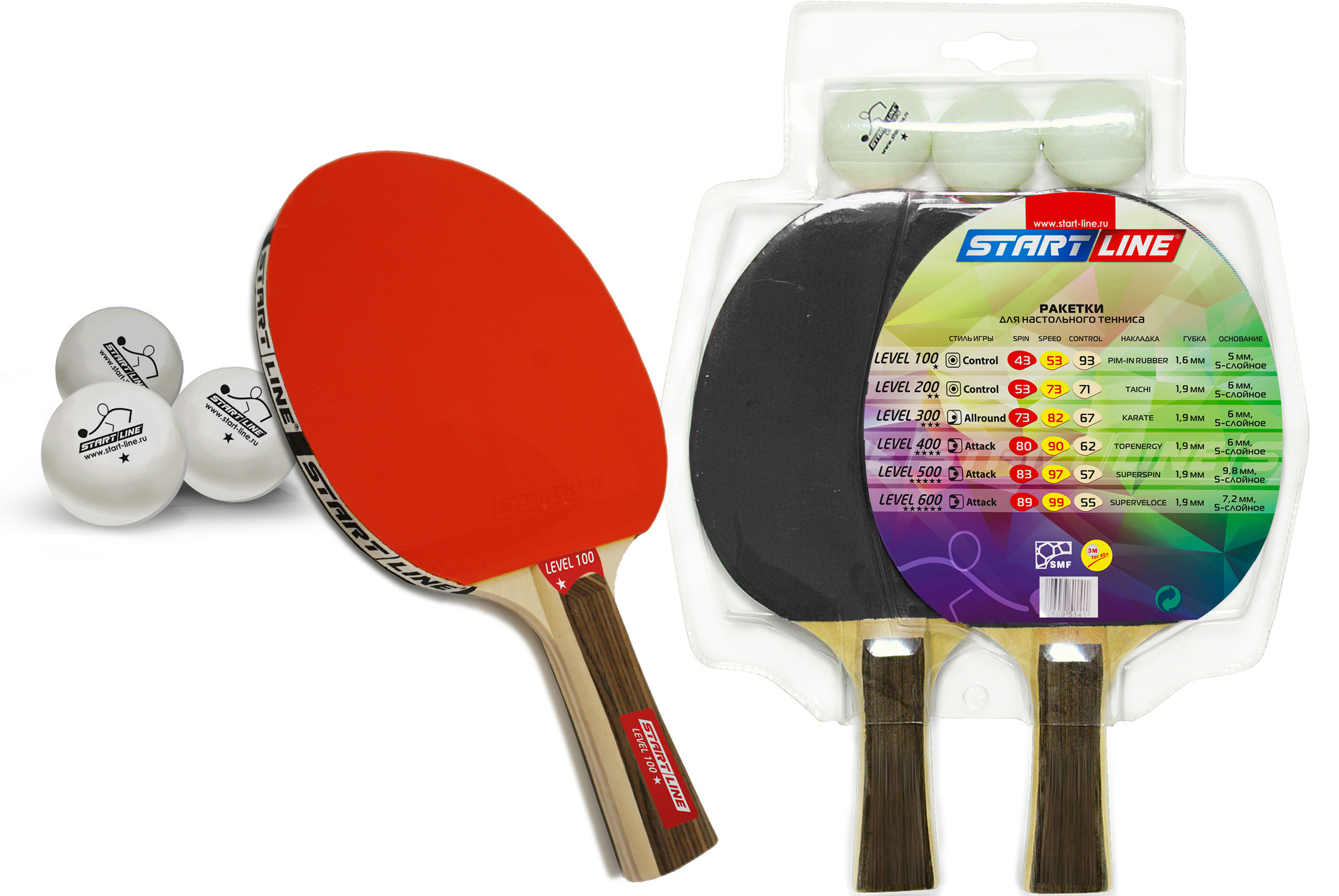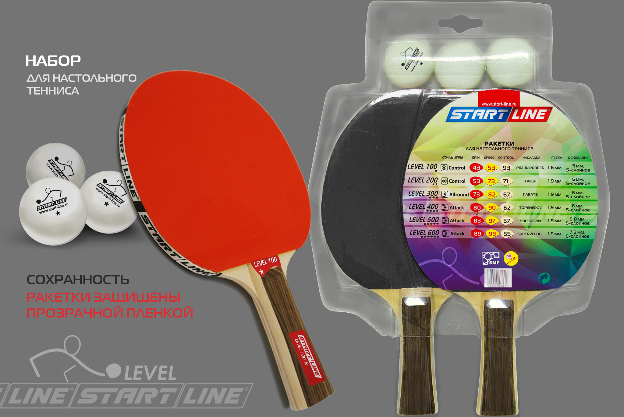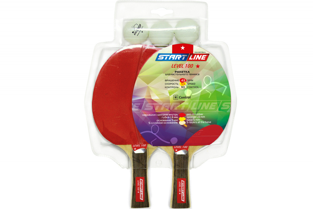Набор START LINE: 2 Ракетки Level 100, 3 Мяча, упаковка блистер