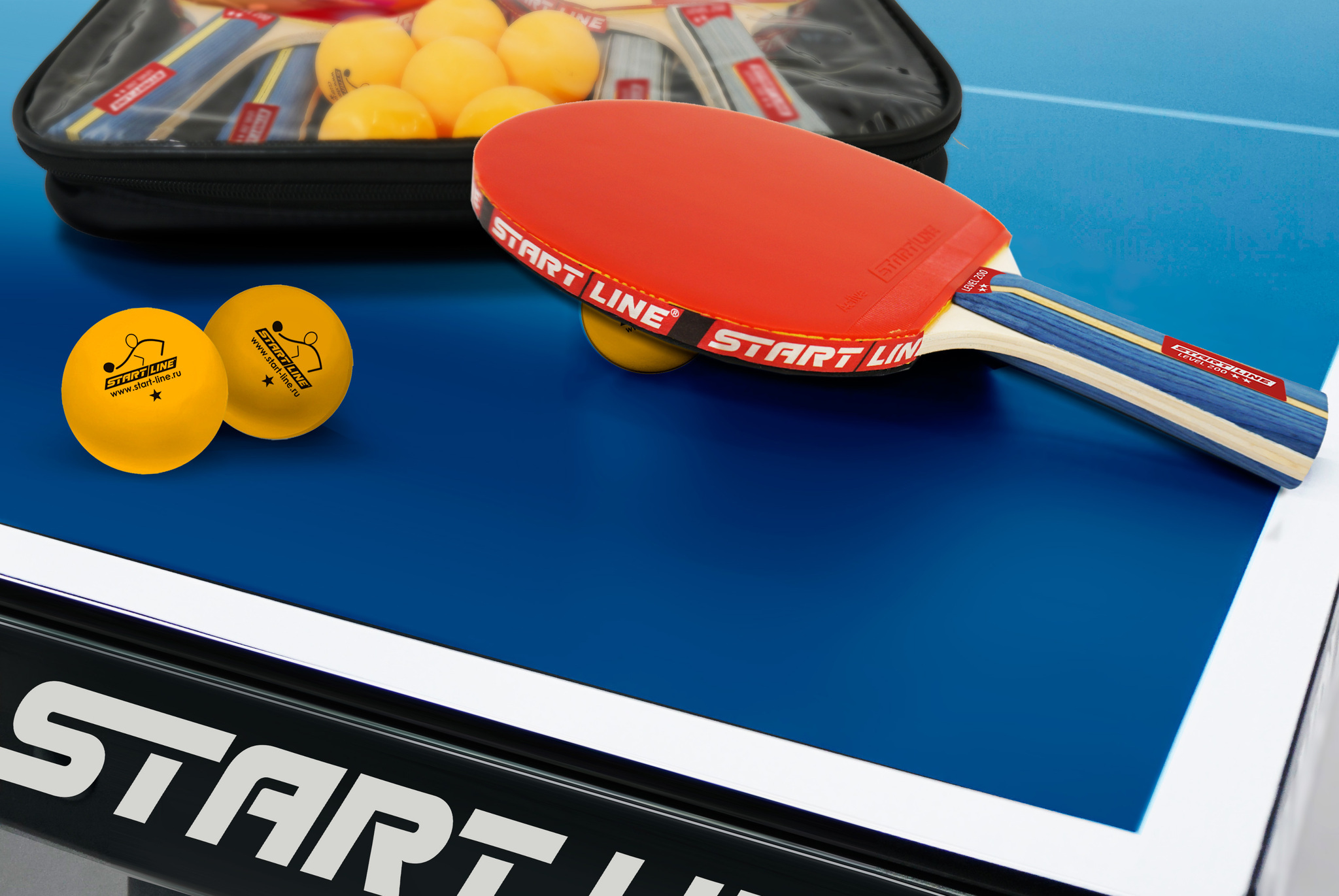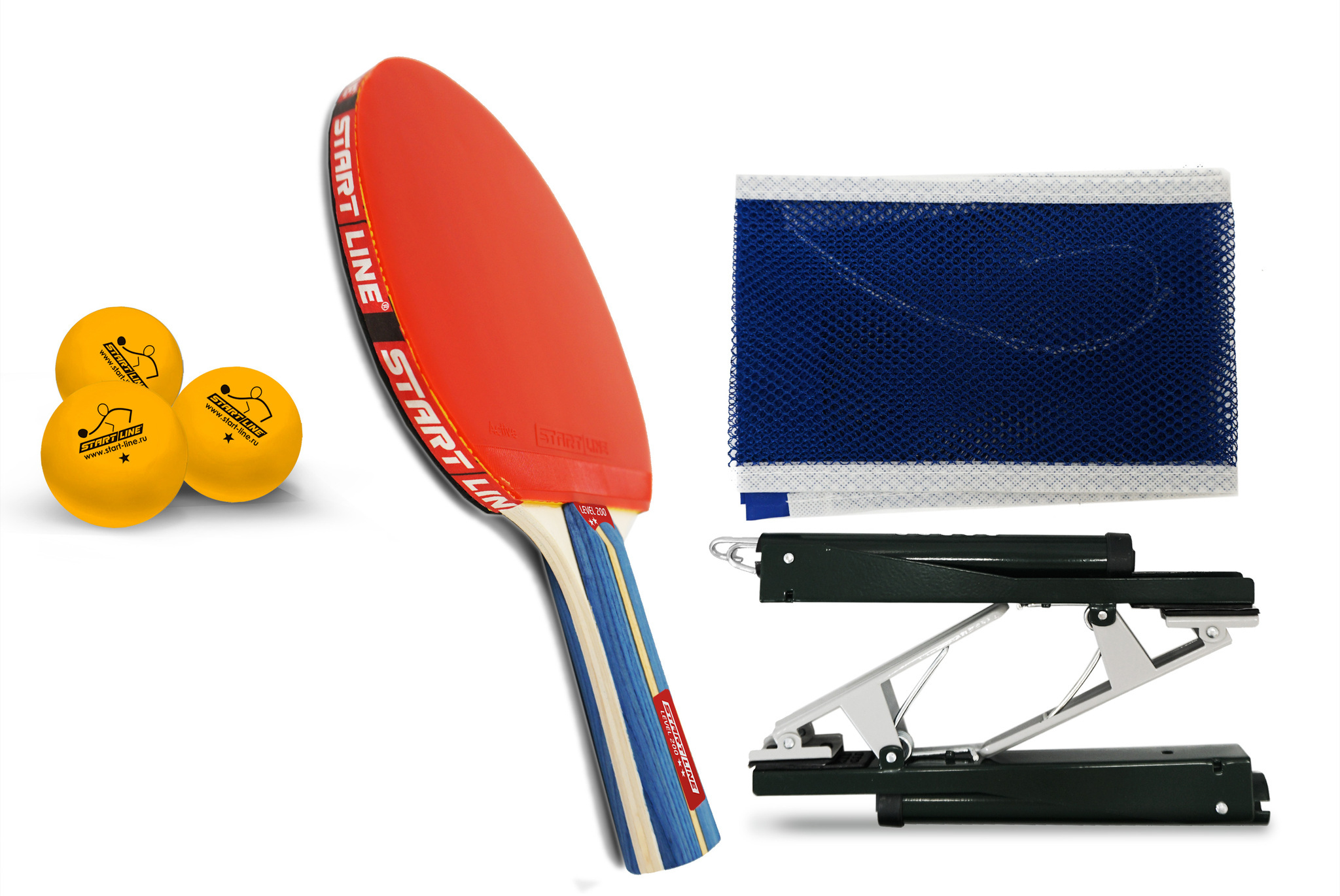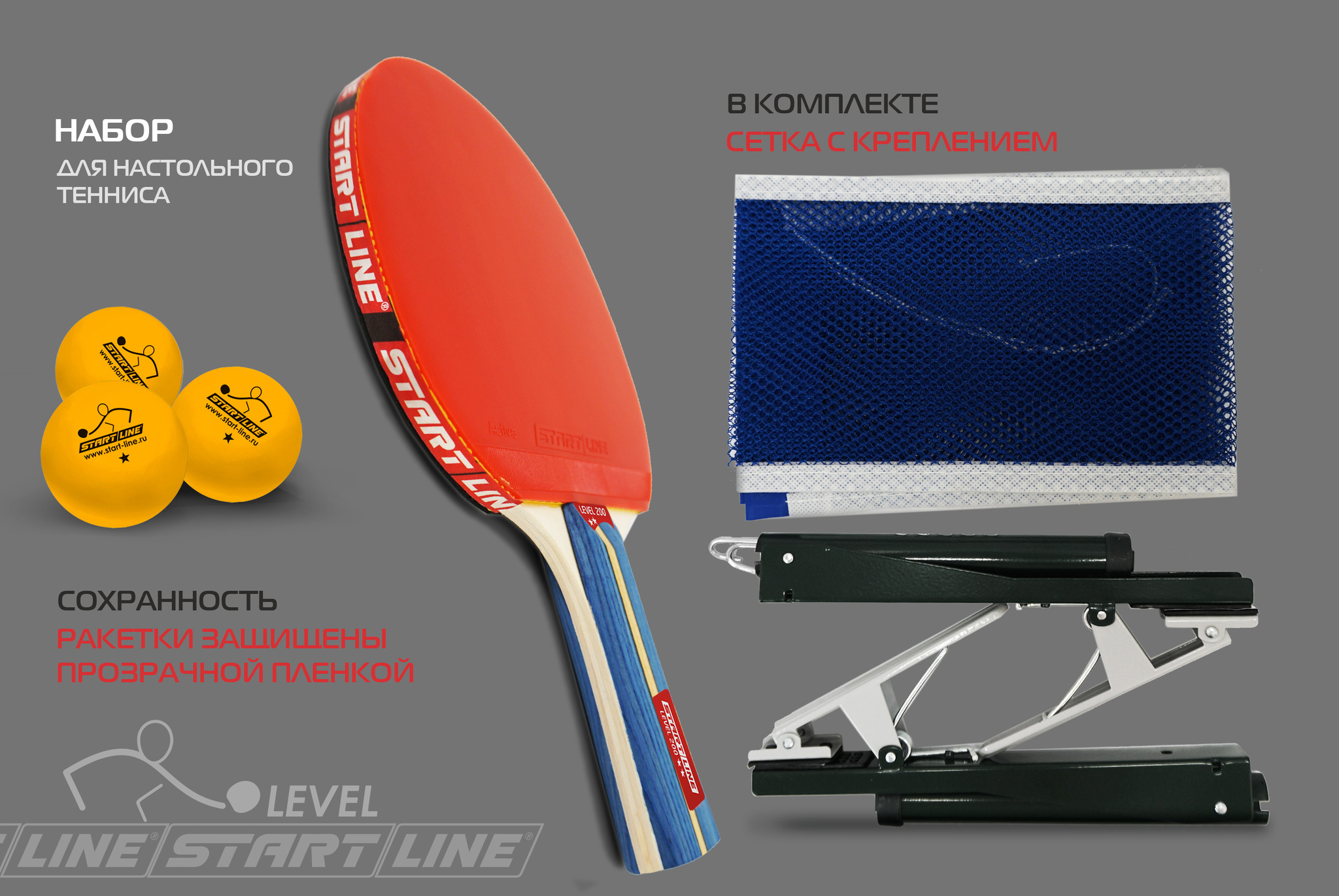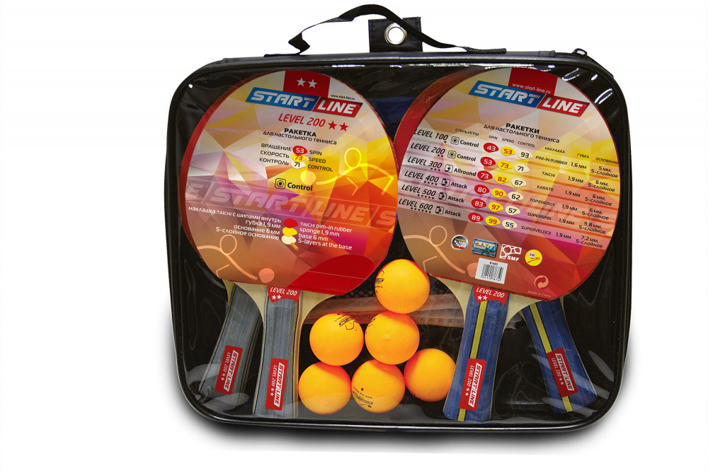 Набор START LINE: 4 Ракетки Level 200, 6 Мячей Club Select. Сетка с креплением, упаковано в сумку на молнии с ручкой.
